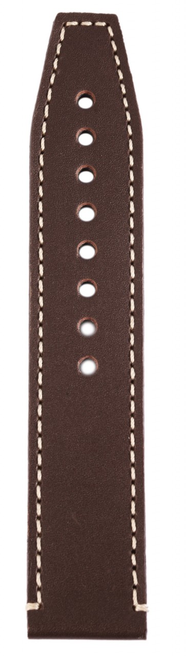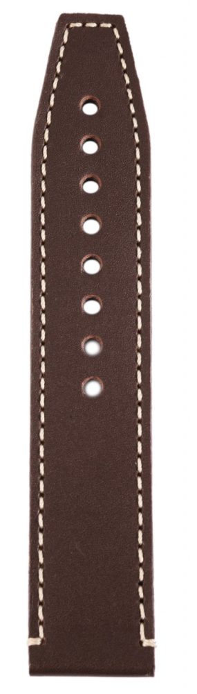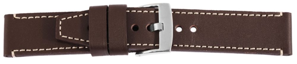 Bracelete básica de pele genuína em castanho escuro com costura branca. A bracelete tem uma fivela prateada e duas presilhas. A parte do furo afunila até uma ponta no final.