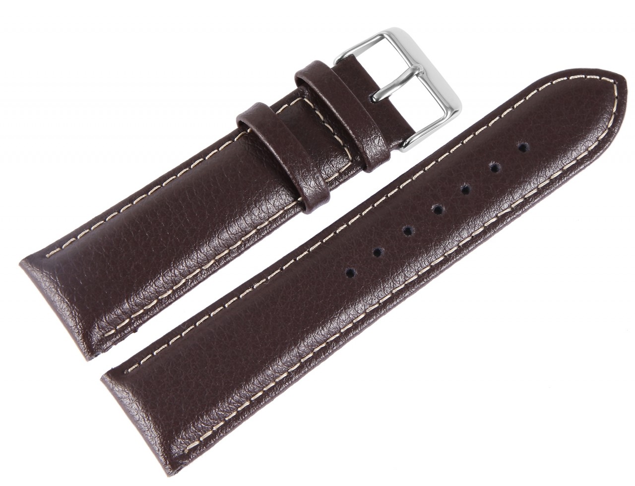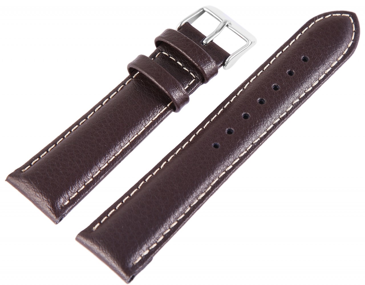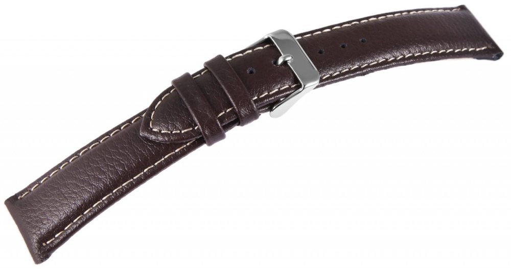 Bracelete básica de pele genuína em castanho escuro decorada com costura branca. A pulseira tem uma fivela prateada e duas presilhas. A parte do furo afunila até uma ponta no final.