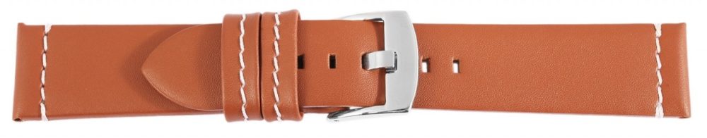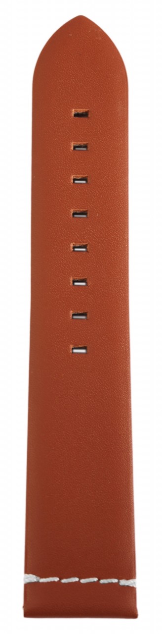 Bracelete básica de pele genuína em castanho claro com costura branca. A bracelete tem uma fivela prateada e duas presilhas. A parte do furo afunila até uma ponta no final.