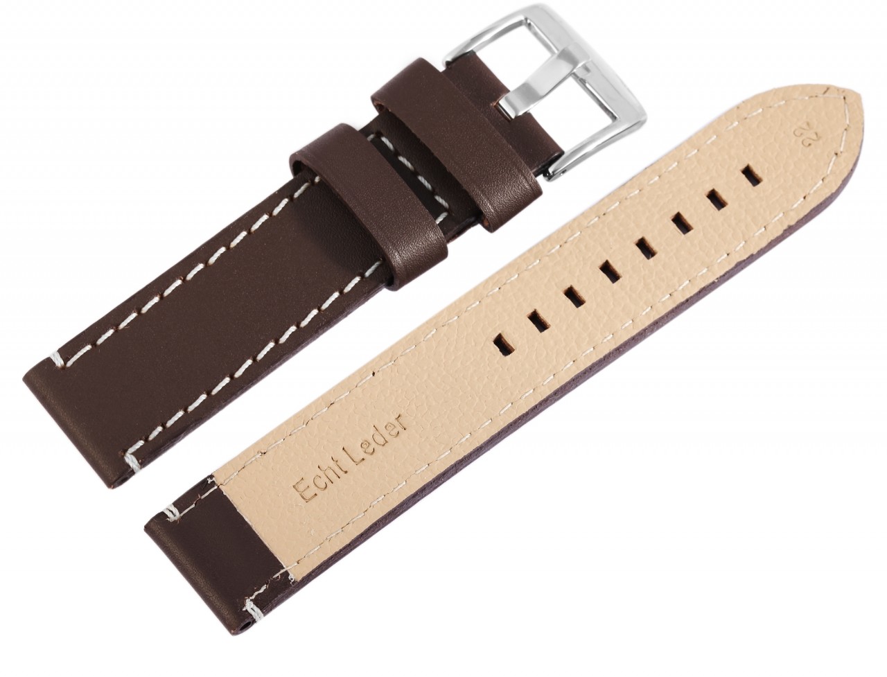 Bracelete básica de pele genuína em castanho escuro com costura branca. A bracelete tem uma fivela prateada e duas presilhas. A parte do furo afunila até uma ponta no final. A bracelete é do tamanho XL e, portanto, é adequada para pulsos maiores.
