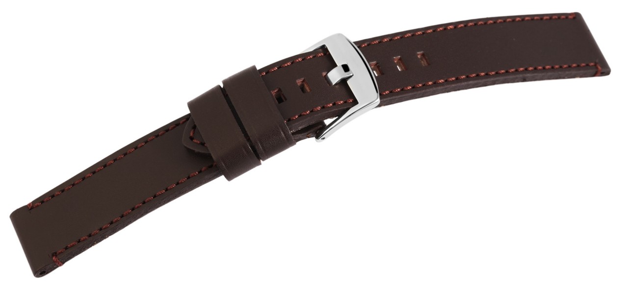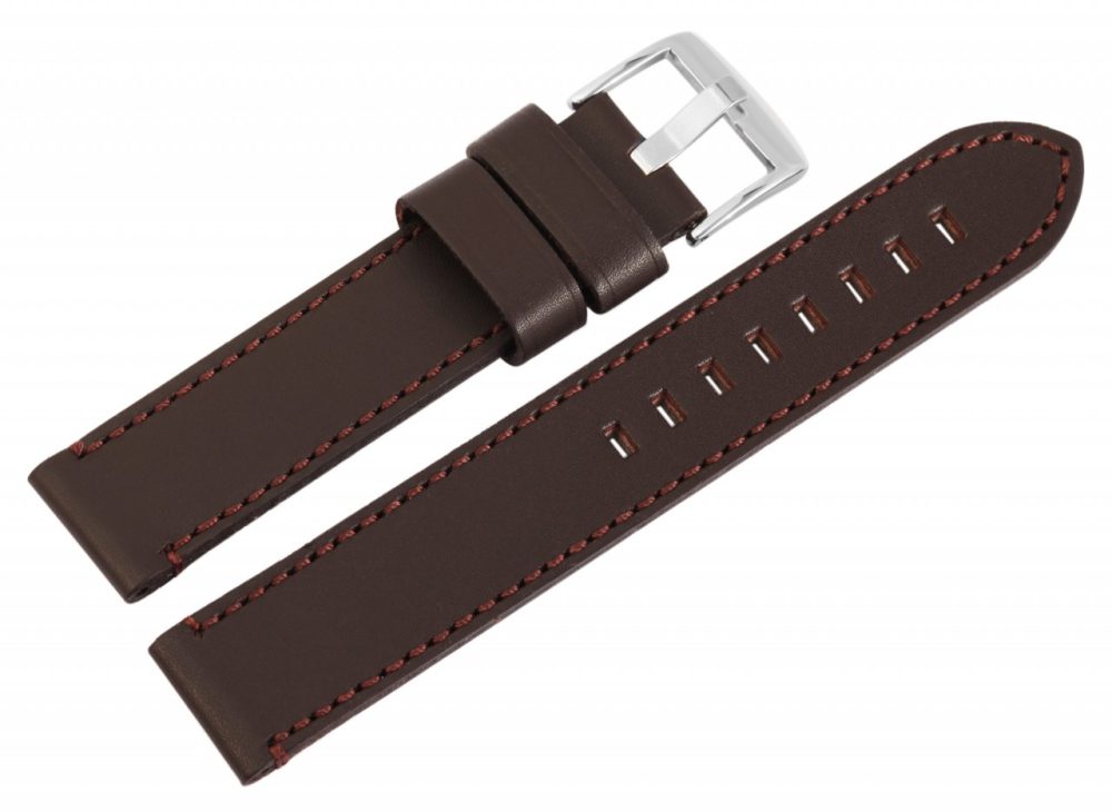 Bracelete básica de pele genuína em castanho escuro com costura castanha. A bracelete tem uma fivela prateada e duas presilhas. A parte do furo afunila até uma ponta no final. A bracelete é do tamanho XL e, portanto, é adequada para pulsos maiores.