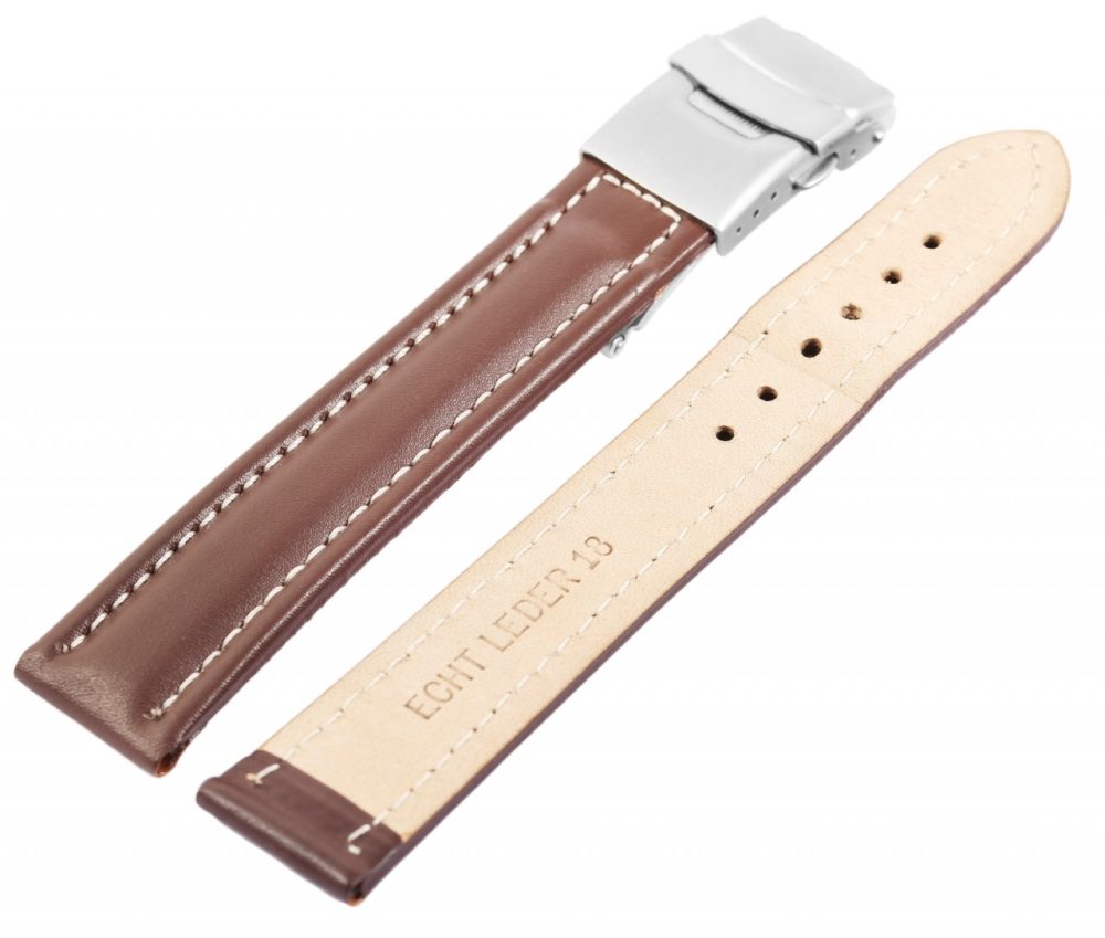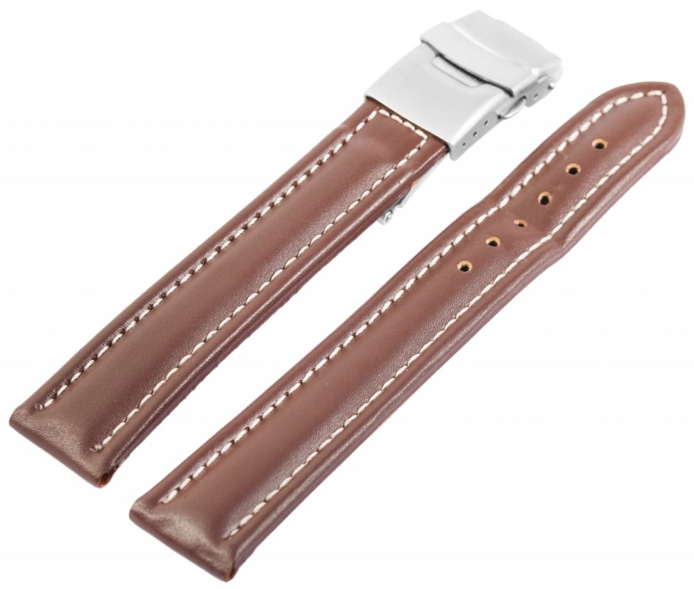 Bracelete clássica de reposição em pele genuína na cor castanha. A costura externa é na cor branca. A parte superior da bracelete é acolchoada. A bracelete possui fecho dobrável em aço inoxidável. A parte do furo afunila até uma ponta no final.