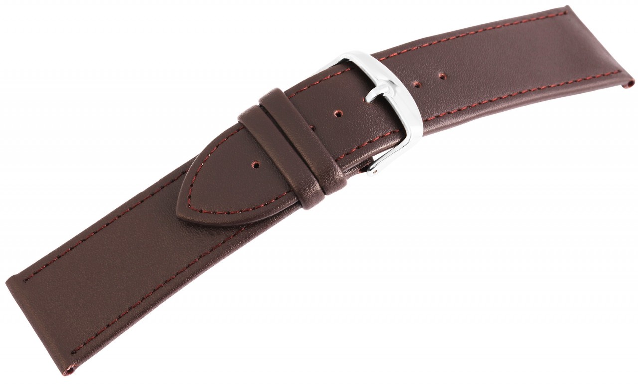 A bracelete de pele genuína castanho escuro está disponível em larguras de 10 mm, 12 mm, 14 mm, 16 mm, 18 mm, 20 mm, 22 mm, 24 mm e 26 mm. Tem uma superfície lisa e acabamento com uma fina costura castanha. A espessura do material é de 3 mm. A bracelete de substituição tem um comprimento total entre 19 cm e 21,5 cm. O comprimento total depende da largura do terminal. A alça do fecho é 2 mm mais estreita que a largura da alça porque a faixa é estreitamente estreita. A bracelete simples do relógio pode ser aberta e fechada com uma fivela de aço inoxidável prateada.
