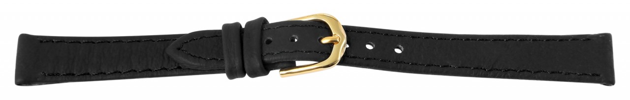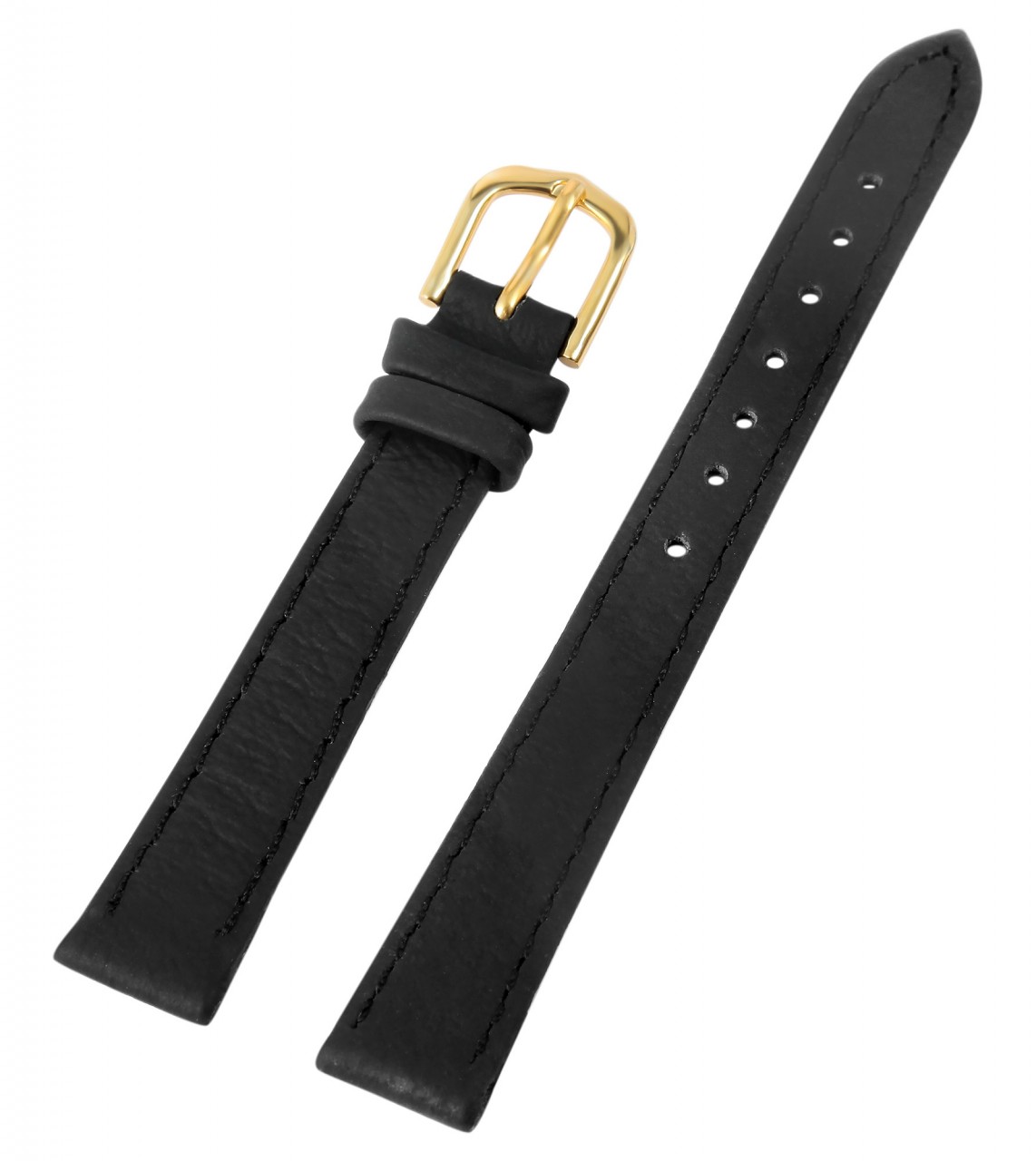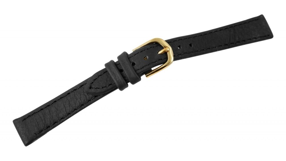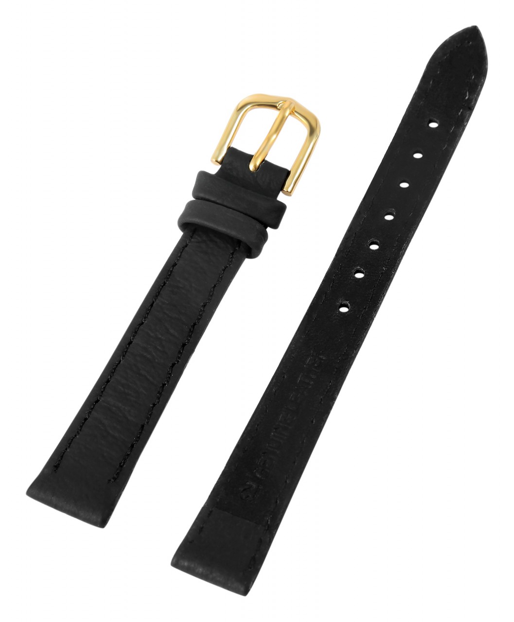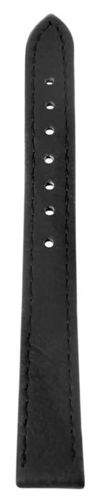 Bracelete de reposição em pele genuína na cor preta. A costura externa é preta da mesma cor. A bracelete tem uma fivela de alfinete e duas presilhas. A parte do furo afunila até uma ponta no final.
