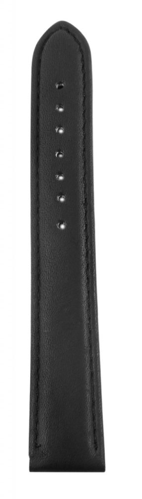 Bracelete de reposição em pele legítima na cor preta. A costura externa é preta da mesma cor.  A bracelete tem uma fivela de pino, duas presilhas e é acolchoada. A parte do furo afunila até uma ponta no final.