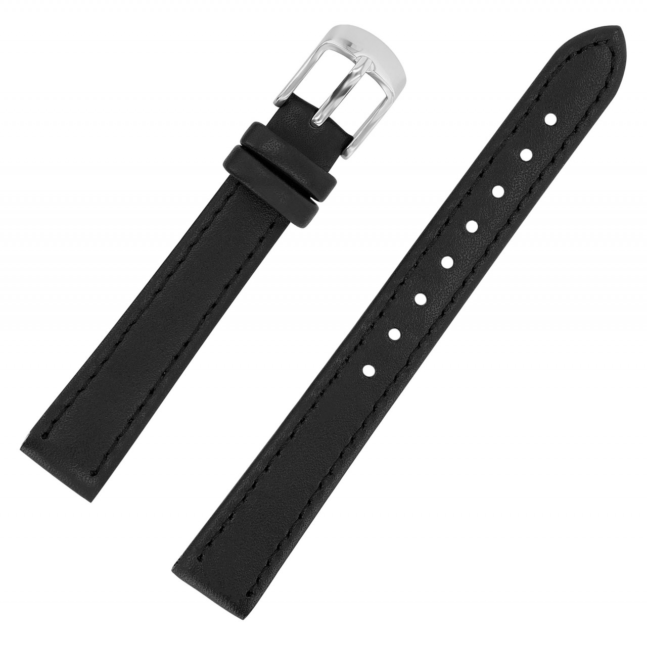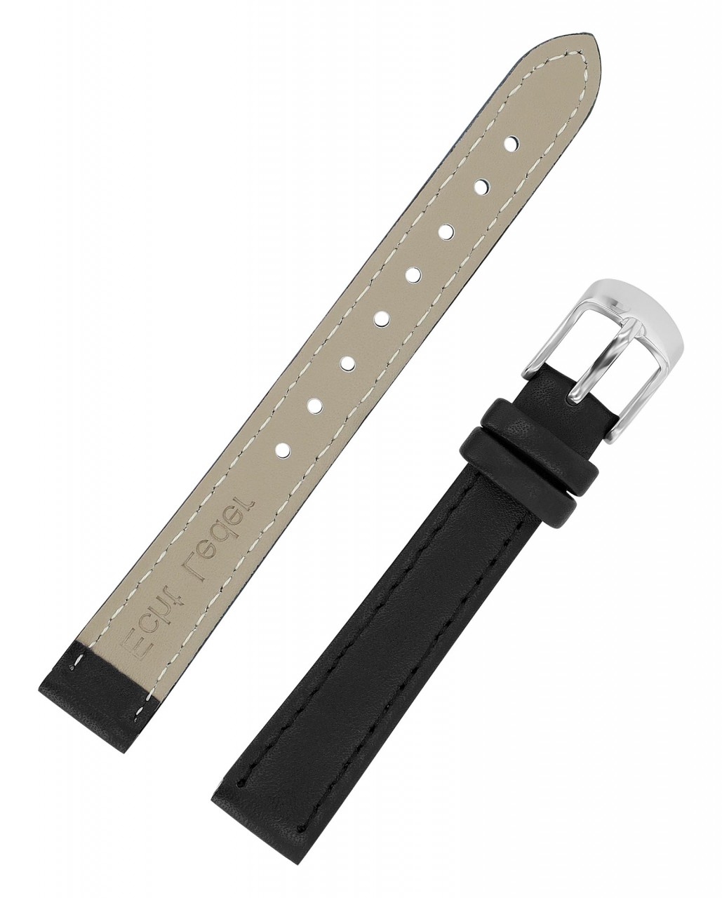 A pulseira preta em couro genuíno está disponível em larguras de 10 mm, 12 mm, 14 mm, 16 mm, 18 mm, 20 mm, 22 mm, 24 mm e 26 mm. Tem uma superfície lisa e acabamento com uma fina costura preta. A espessura do material é de 3 mm. A pulseira de substituição tem um comprimento total entre 19 cm e 21,5 cm. O comprimento total depende da largura do terminal. A alça do fecho é 2 mm mais estreita que a largura da alça porque a faixa é estreitamente estreita. Pode ser aberto e fechado com uma fivela prateada.