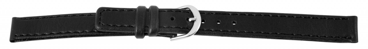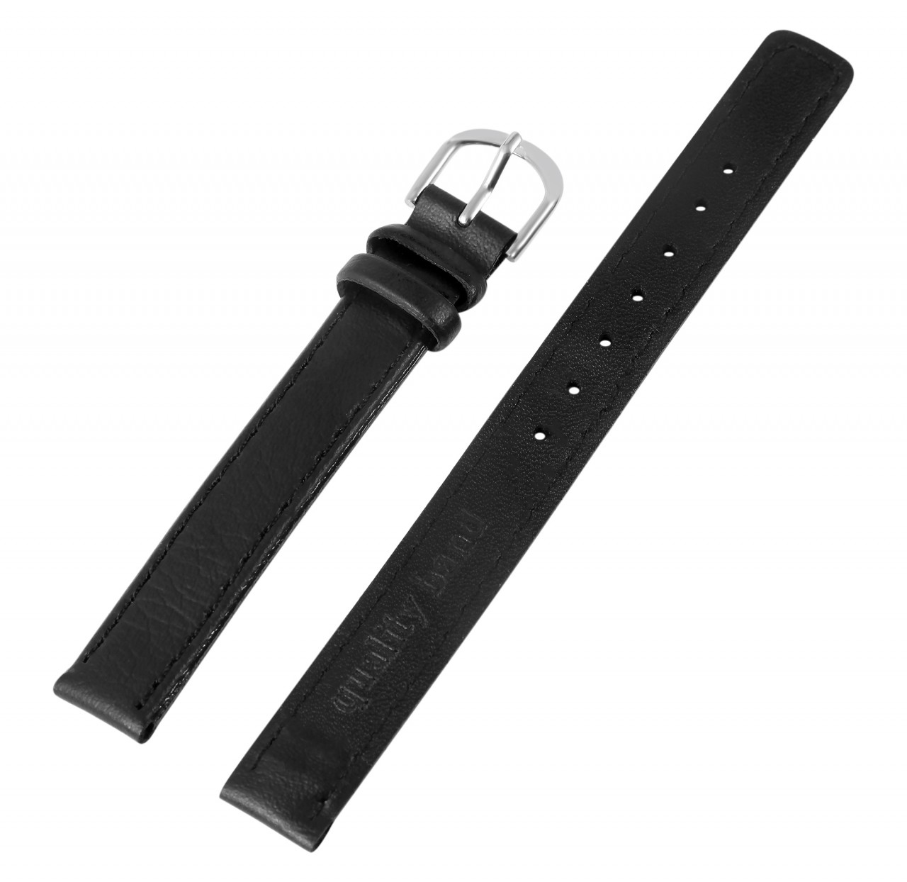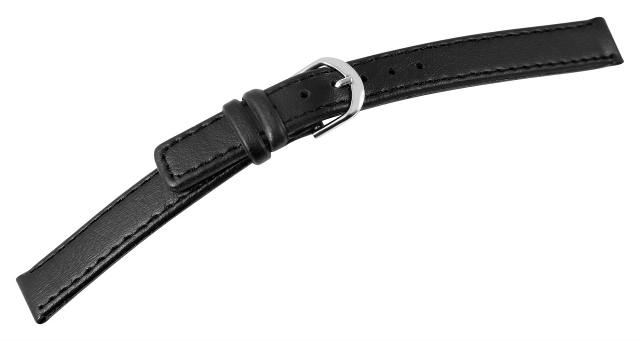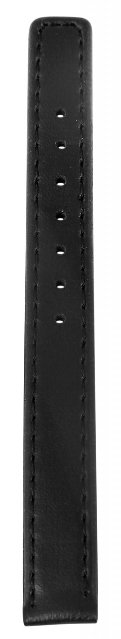 Bracelete de reposição em pele genuína na cor preta. A costura externa é preta da mesma cor. A bracelete tem uma fivela de alfinete e duas presilhas. A parte do furo afunila no final.