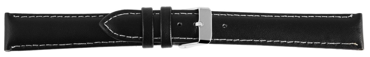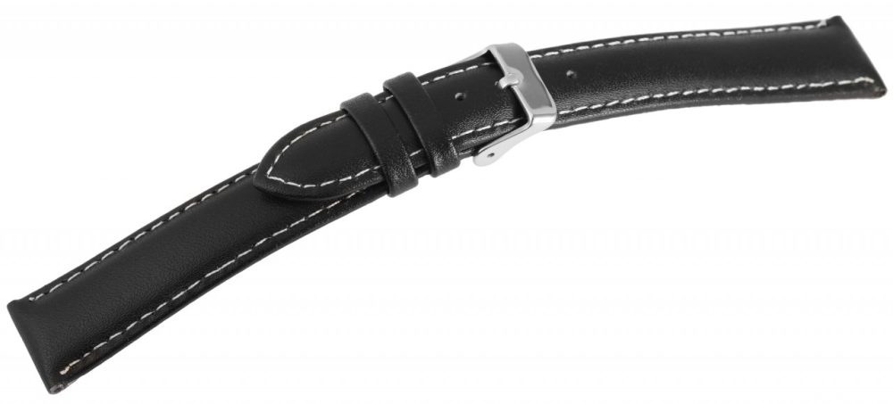 A bracelete preta em pele genuína está disponível em larguras de 12 mm, 14 mm, 16 mm, 18 mm, 20 mm, 22 mm e 24 mm. A bracelete de pele é levemente acolchoada, portanto a espessura do material é de aproximadamente 4 mm. Tem superfície lisa e costurada com costura branca na parte externa. O comprimento total da tira é de 21 cm, que se divide na parte do fecho com 9 cm e na parte do furo com 12 cm. A alça do fecho é 2 mm mais estreita que a largura da alça porque a faixa é estreita. Uma fivela prateada é presa à alça e o primeiro laço é costurado.