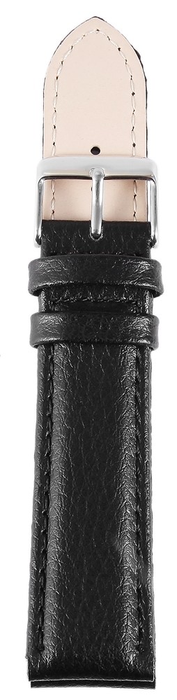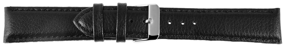 A pulseira preta em couro genuíno está disponível em larguras de 12 mm, 14 mm, 16 mm, 18 mm, 20 mm, 22 mm e 24 mm. A pulseira de couro é levemente acolchoada para ter uma espessura de material de aproximadamente 4 mm. Possui superfície rugosa com fino relevo e é decorada com costura preta na parte externa. O comprimento total da tira é de 21 cm, que se divide na parte do fecho com 9 cm e na parte do furo com 12 cm. A alça do fecho é 2 mm mais estreita que a largura da alça porque a faixa é estreitamente estreita. A pulseira de substituição do relógio pode ser aberta e fechada usando um fecho dobrável em aço inoxidável prateado.