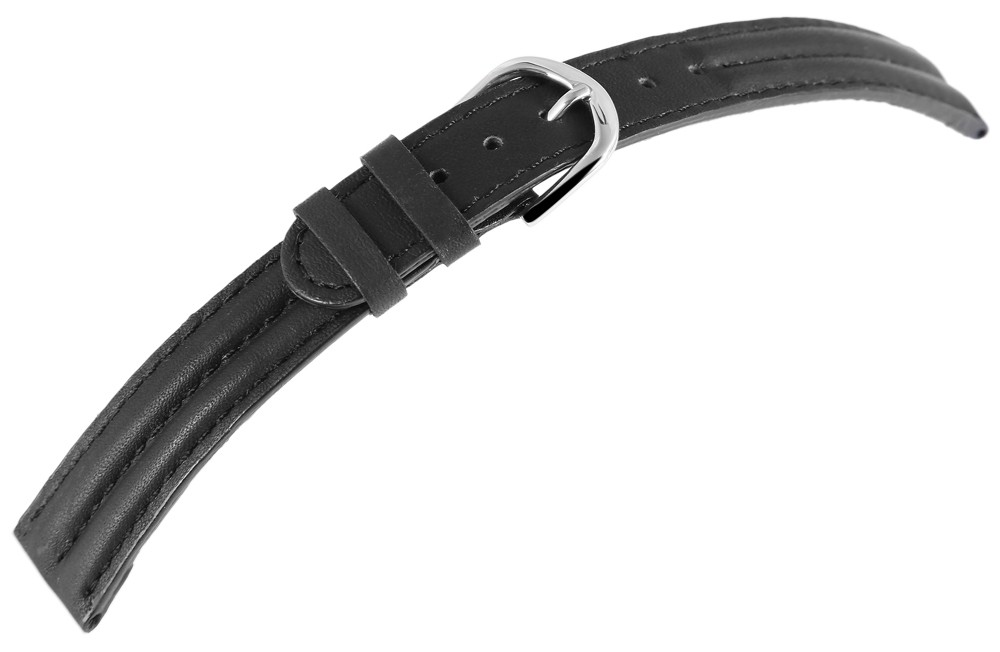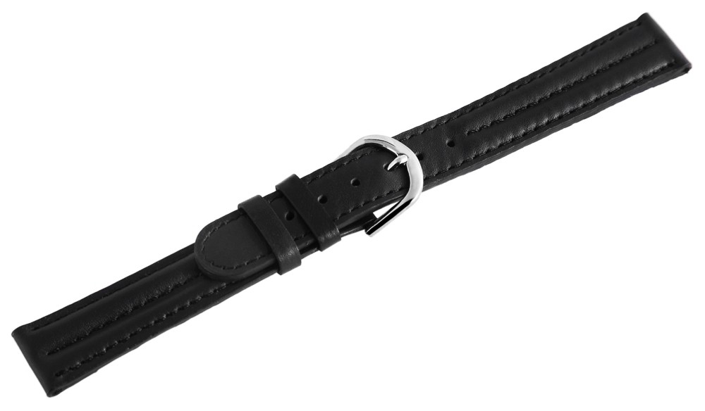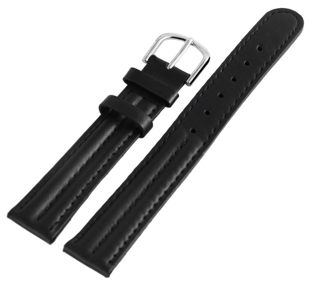 Bracelete preta para relógio em pele genuína tem 16 mm com fivela de pino em aço inoxidável.
