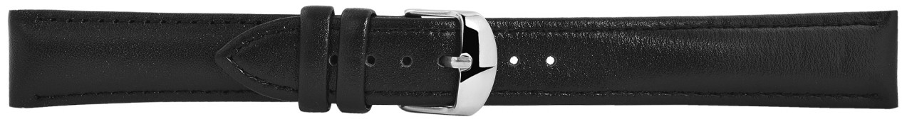 A pulseira preta do relógio é feita de couro genuíno e está disponível em larguras de 12 mm, 14 mm, 16 mm, 18 mm, 20 mm, 22 mm, 24 mm e 26 mm. Tem uma superfície lisa, é acolchoada e recortada com uma fina costura preta. A espessura do material é de 5 mm. A alça do fecho é 2 mm mais estreita que a largura da alça porque a faixa é estreitamente estreita. O comprimento total depende da largura da saliência e varia de 19,5 cm a 21,5 cm. A pulseira de reposição pode ser aberta e fechada com uma fivela prateada.