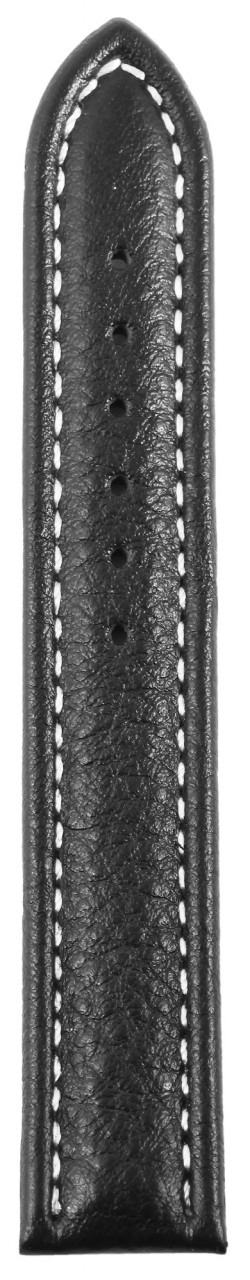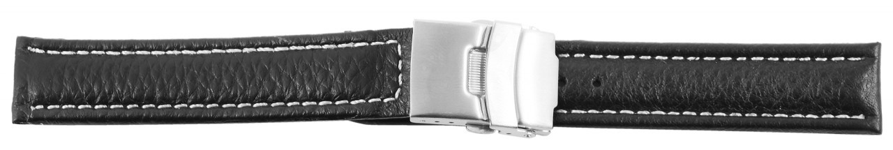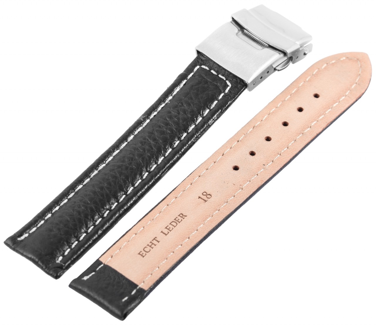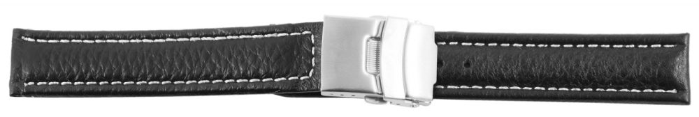 Pulseira de reposição clássica em pele genuína na cor preta. A costura externa é da mesma cor. A parte superior da pulseira é acolchoada. A pulseira tem um fecho dobrável prateado. A parte do furo afunila até uma ponta no final.