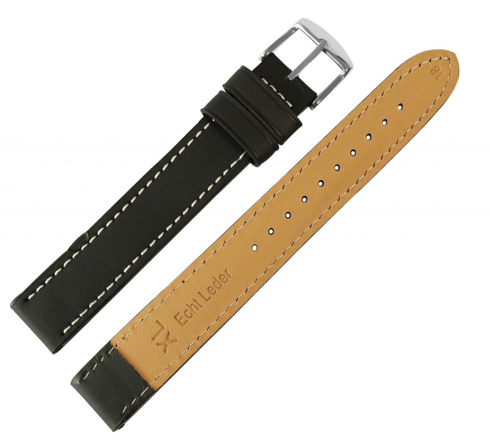 Pulseira básica de couro genuíno em preto decorada com costura branca. A pulseira tem uma fivela prateada e duas presilhas. A parte do furo afunila até uma ponta no final. As pulseiras são em XL e, portanto, também são adequadas para pulsos maiores