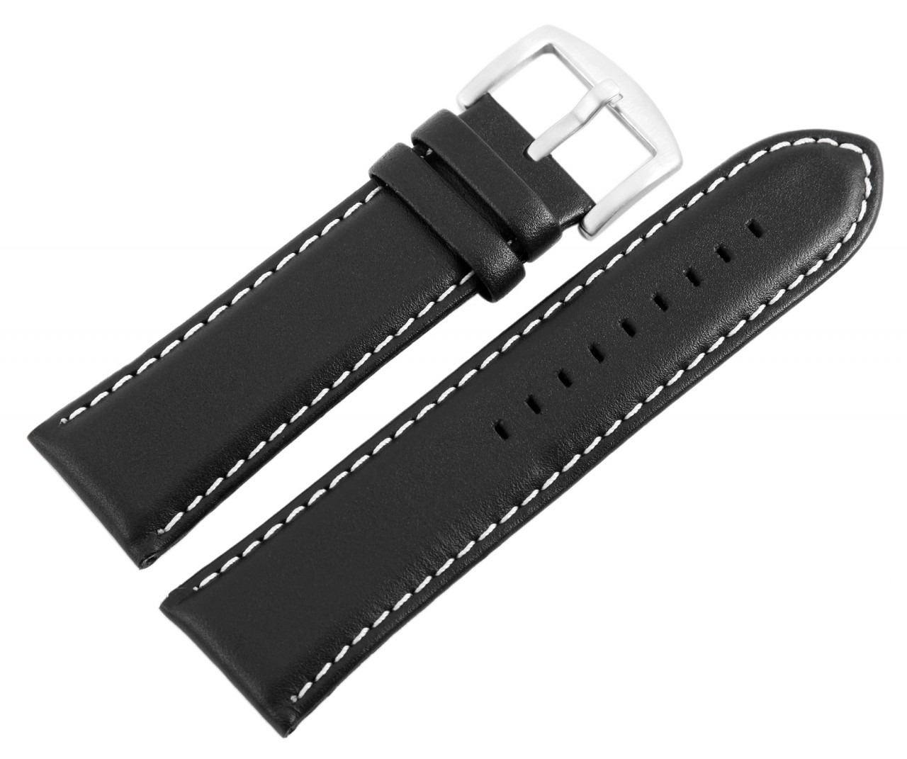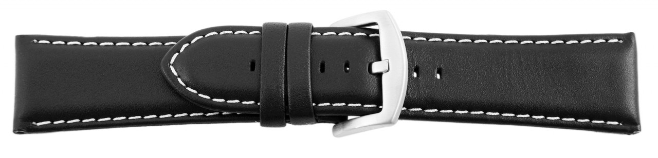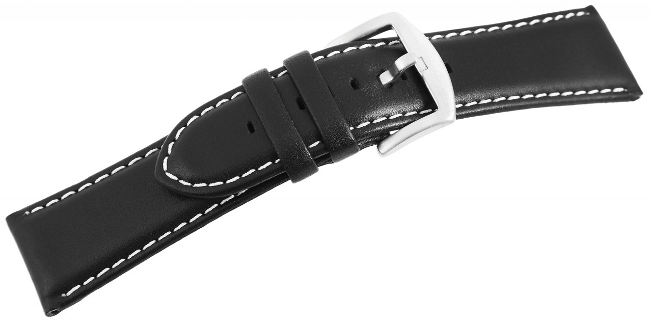 Correia de substituição clássica em pele genuína na cor vermelha e costura exterior em branco a condizer. O terminal da ponte é acolchoado em ambos os lados. A pulseira tem uma fivela prateada e duas presilhas. A parte do furo afunila até uma ponta no final.