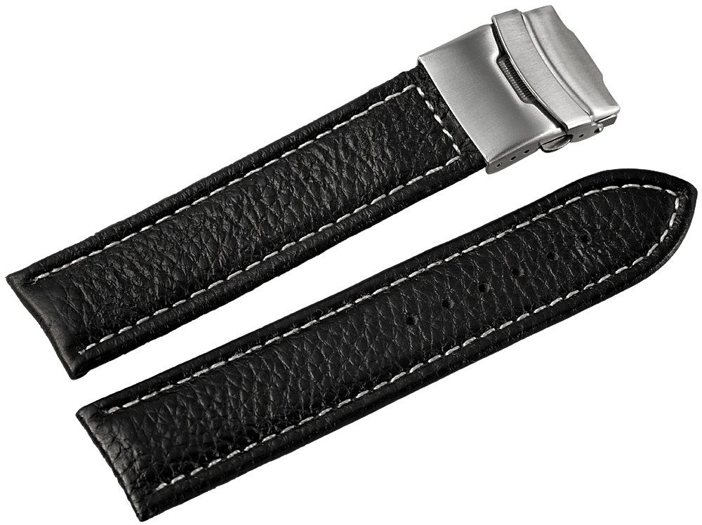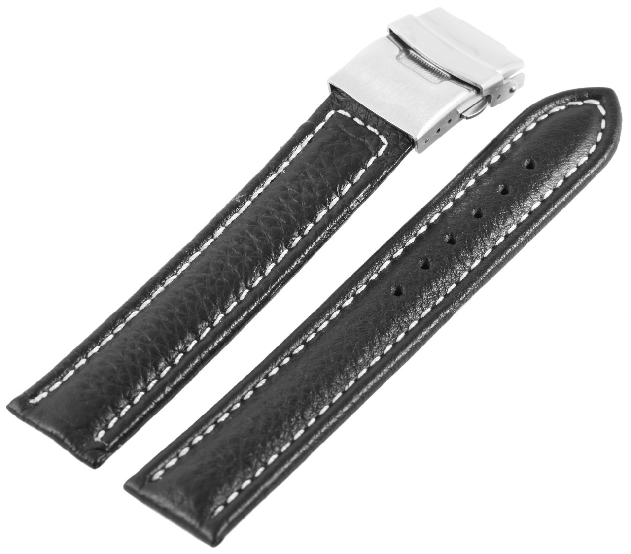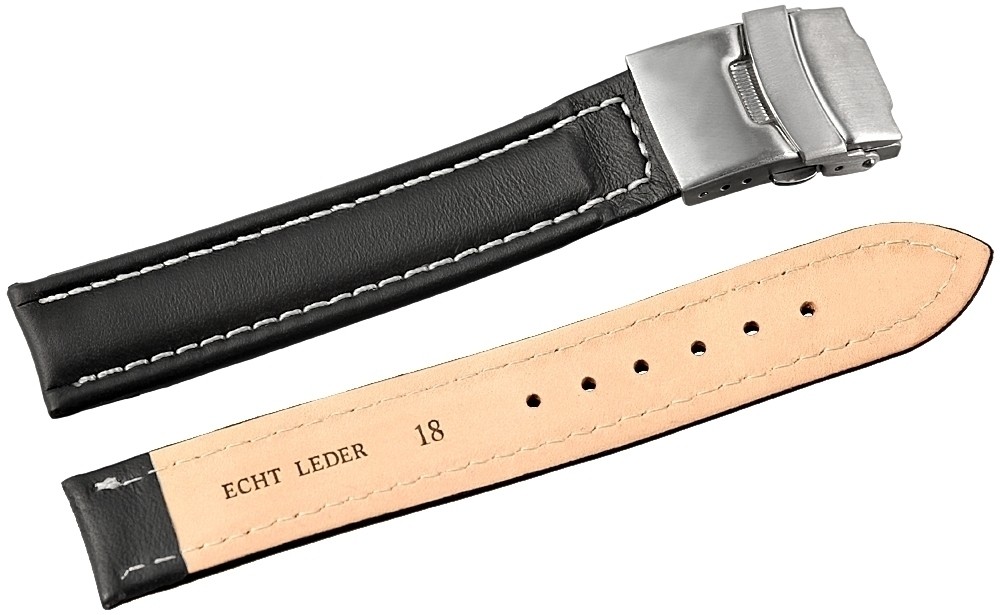 Pulseira de reposição clássica em pele genuína na cor preta. A costura externa é da mesma cor. A parte superior da pulseira é acolchoada. A pulseira tem um fecho dobrável prateado. A parte do furo afunila até uma ponta no final.