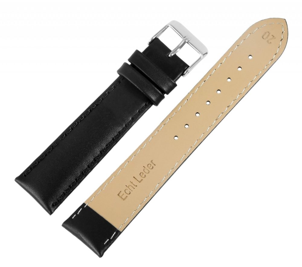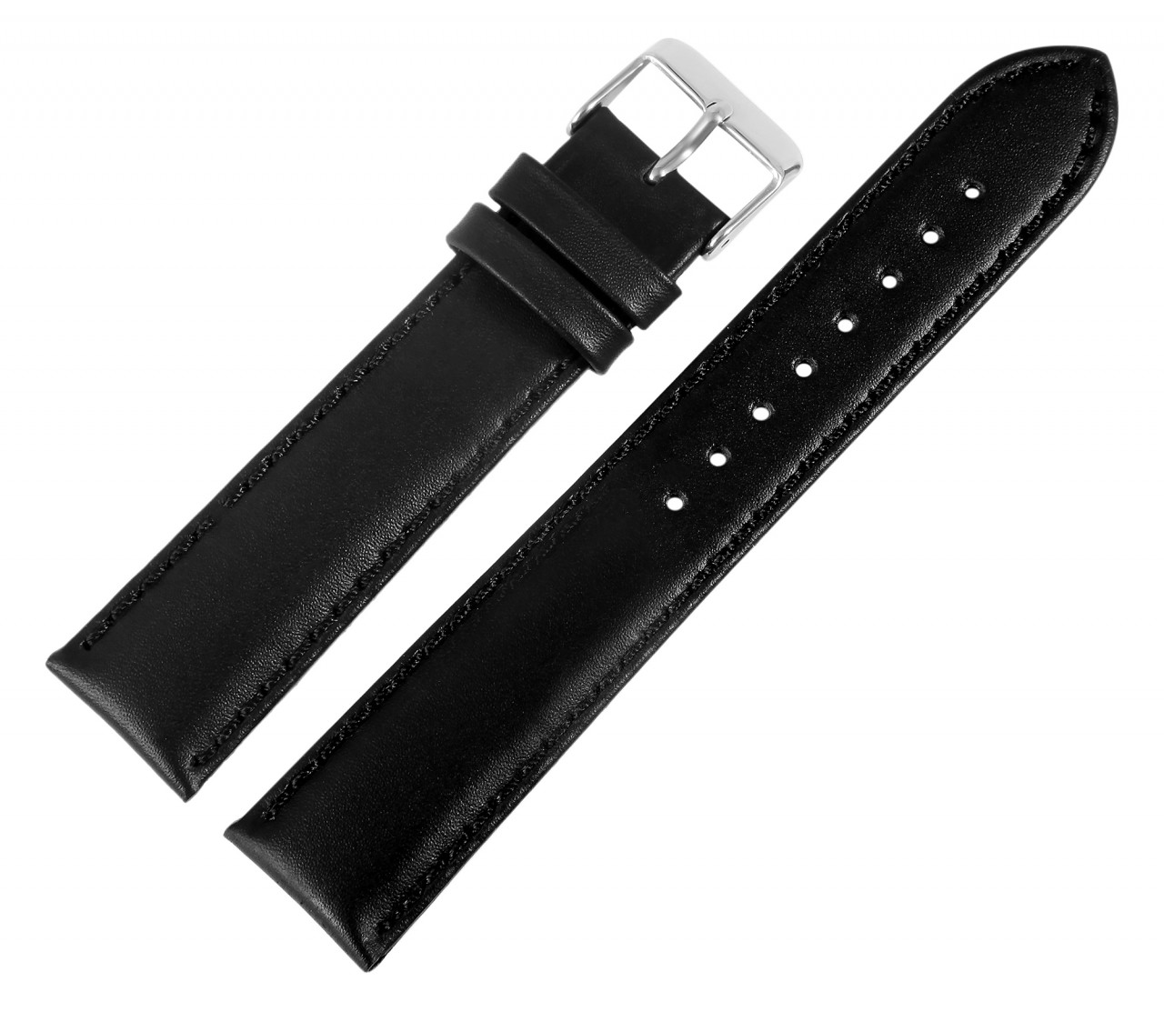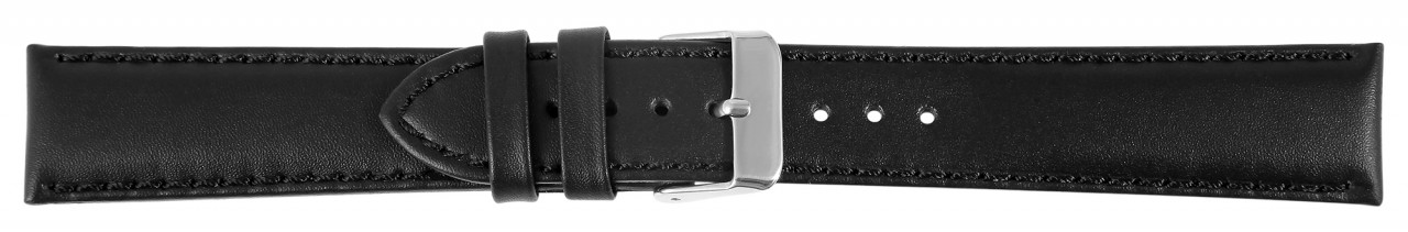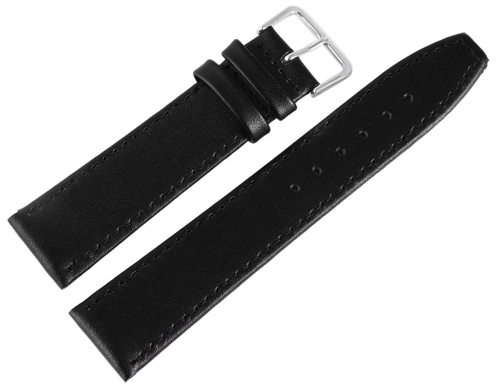 Pulseira básica de couro genuíno em preto decorada com costura preta. A pulseira tem uma fivela prateada e duas presilhas. A parte do furo afunila até uma ponta no final.