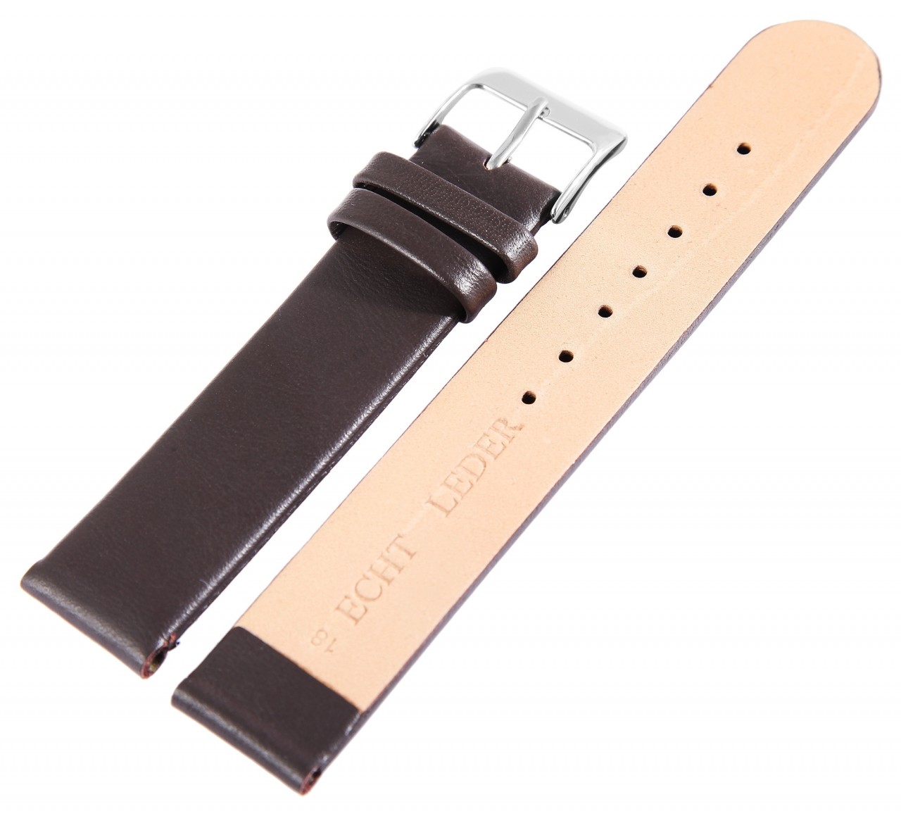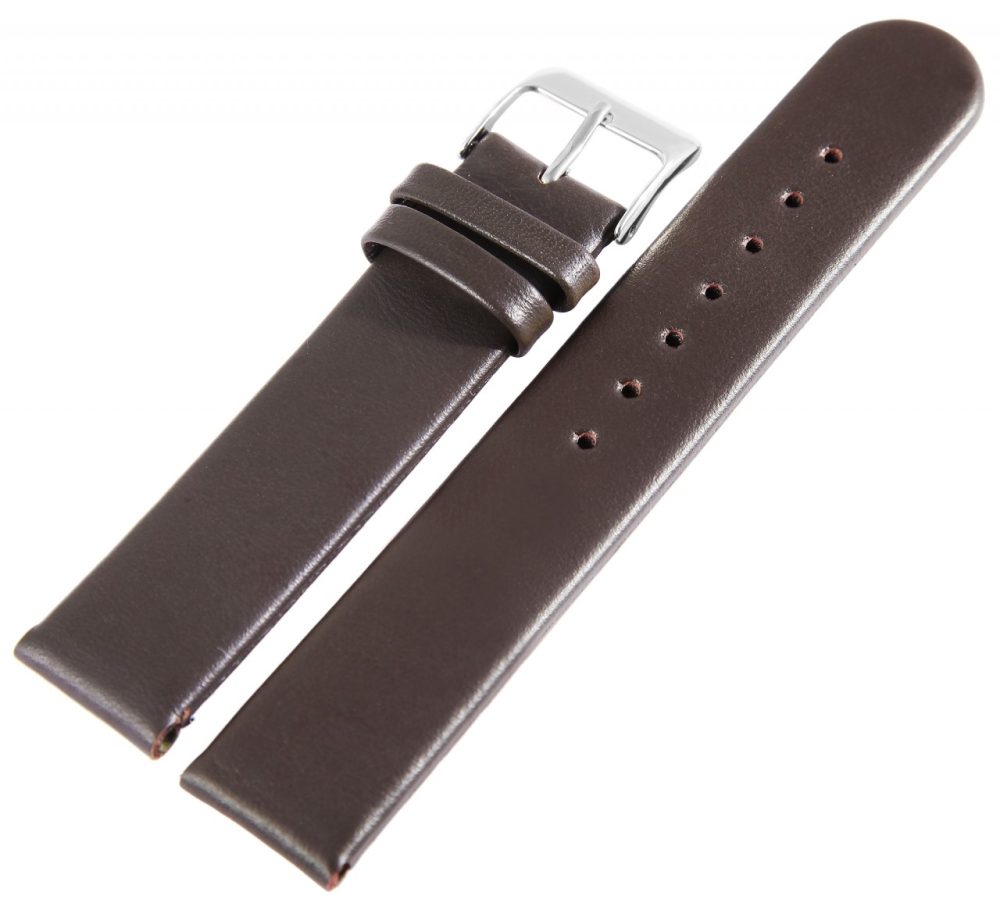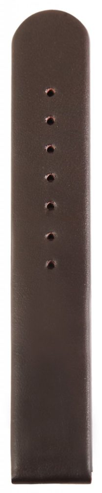 Bracelete castanha em pele genuína de alta qualidade. Possui uma fivela de pino de aço inoxidável prateado e duas presilhas de pulseira. A parte do furo afunila no final.