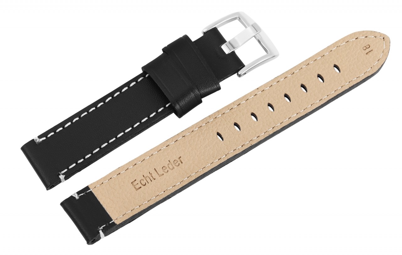 Pulseira básica de couro genuíno na cor preta com costura branca. A pulseira tem uma fivela prateada e duas presilhas. A parte do furo afunila até uma ponta no final.