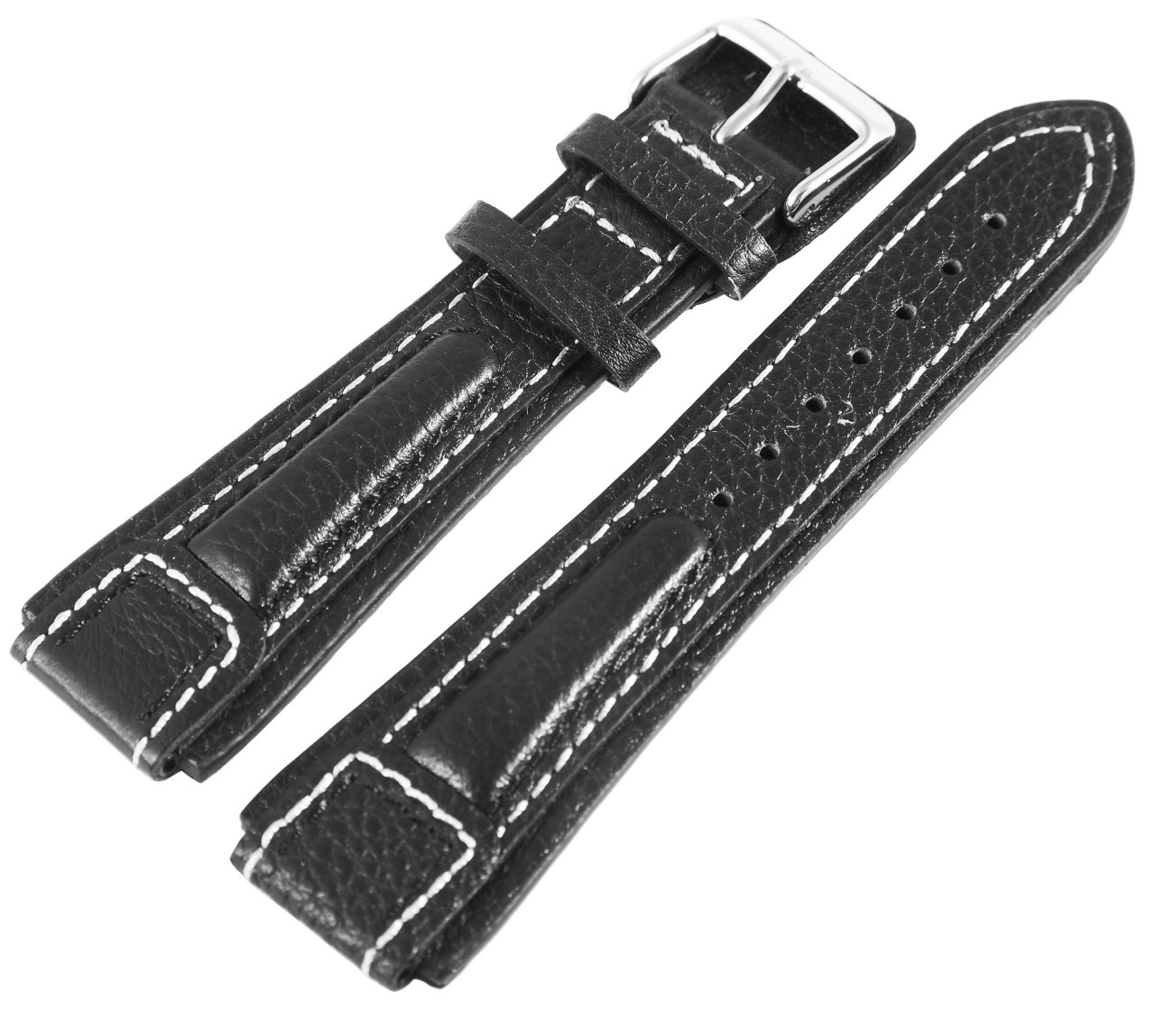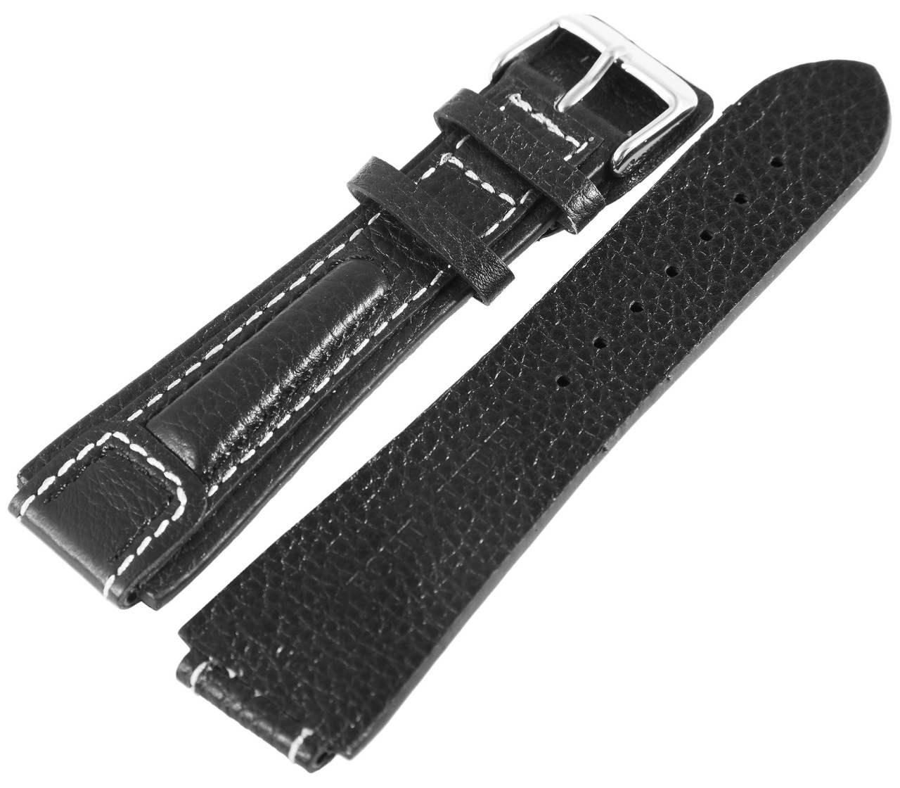 Pulseira de reposição clássica em couro genuíno na cor preta. A costura externa é na cor branca. O terminal da ponte é acolchoado em ambos os lados. Foi feito de couro de vaca. A pulseira tem uma fivela prateada e duas presilhas. A parte do furo afunila até uma ponta no final.
