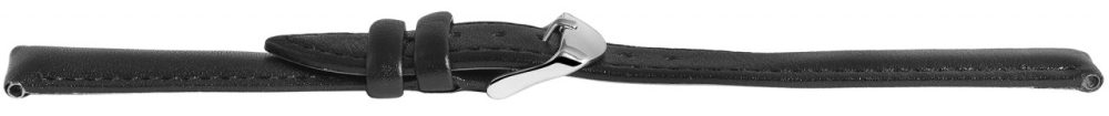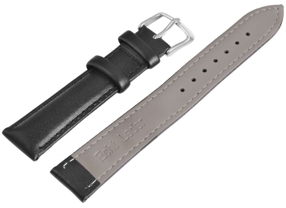 A pulseira preta do relógio é feita de couro genuíno e está disponível em larguras de 12 mm, 14 mm, 16 mm, 18 mm, 20 mm, 22 mm, 24 mm e 26 mm. Tem uma superfície lisa, é acolchoada e recortada com uma fina costura preta. A espessura do material é de 5 mm. A alça do fecho é 2 mm mais estreita que a largura da alça porque a faixa é estreitamente estreita. O comprimento total depende da largura da saliência e varia de 19,5 cm a 21,5 cm. A pulseira de reposição pode ser aberta e fechada com uma fivela prateada.