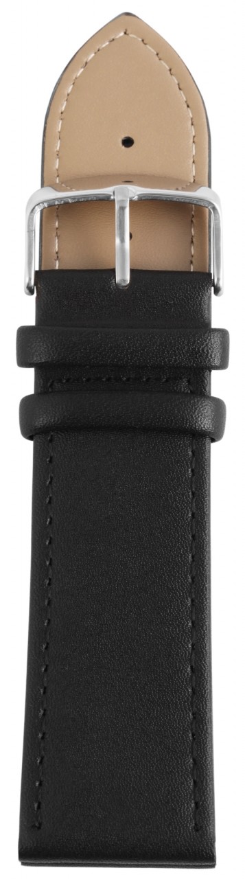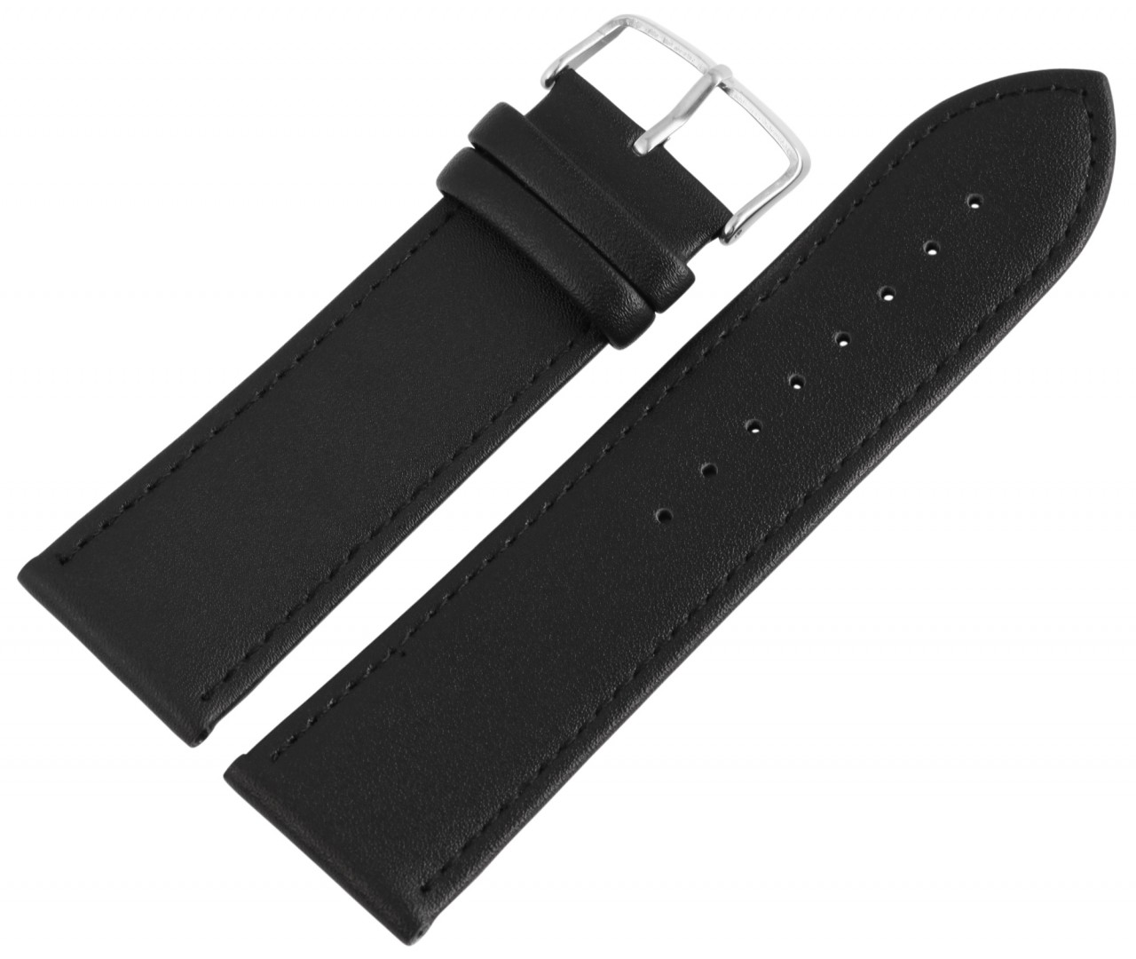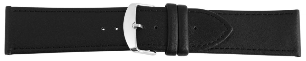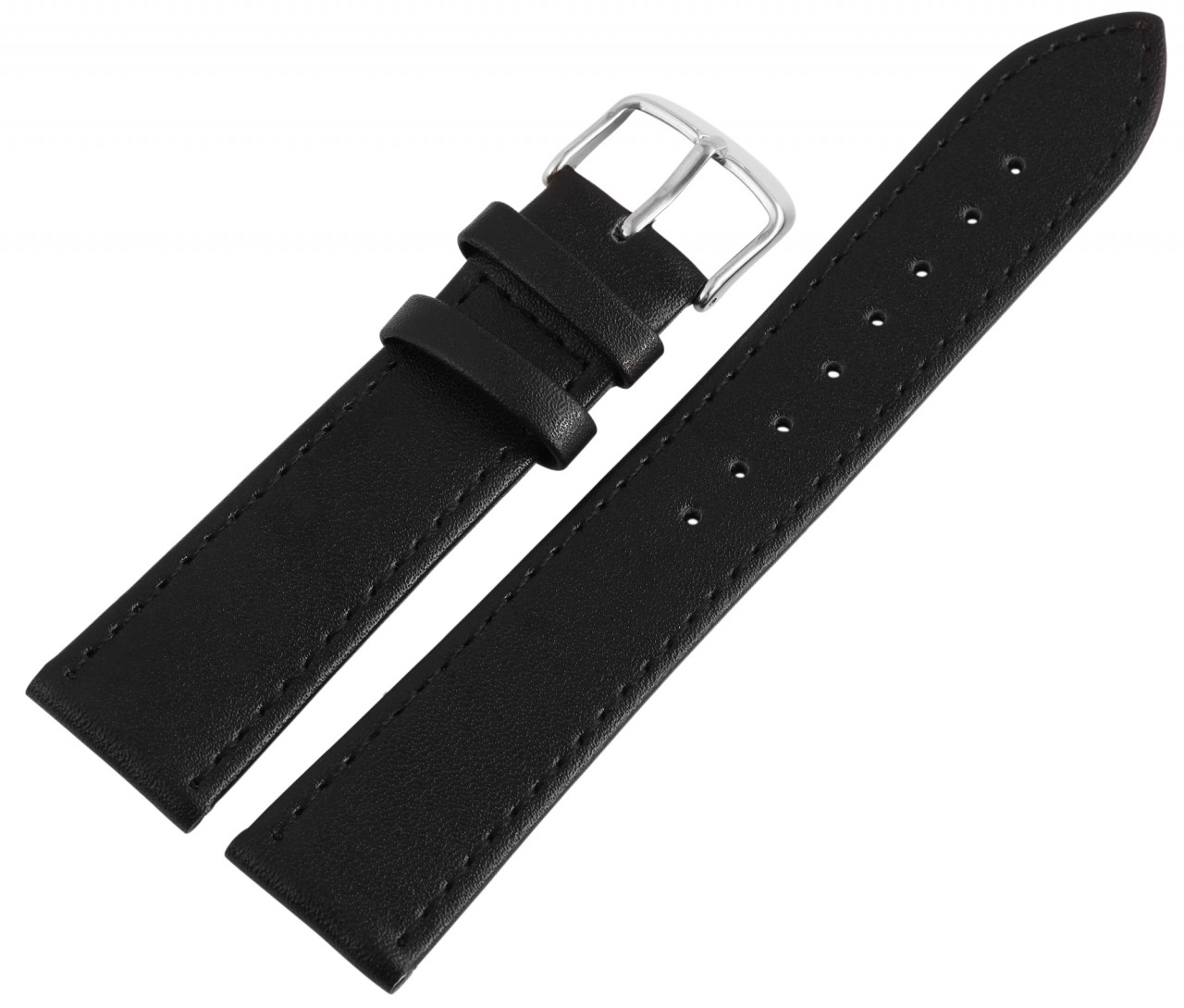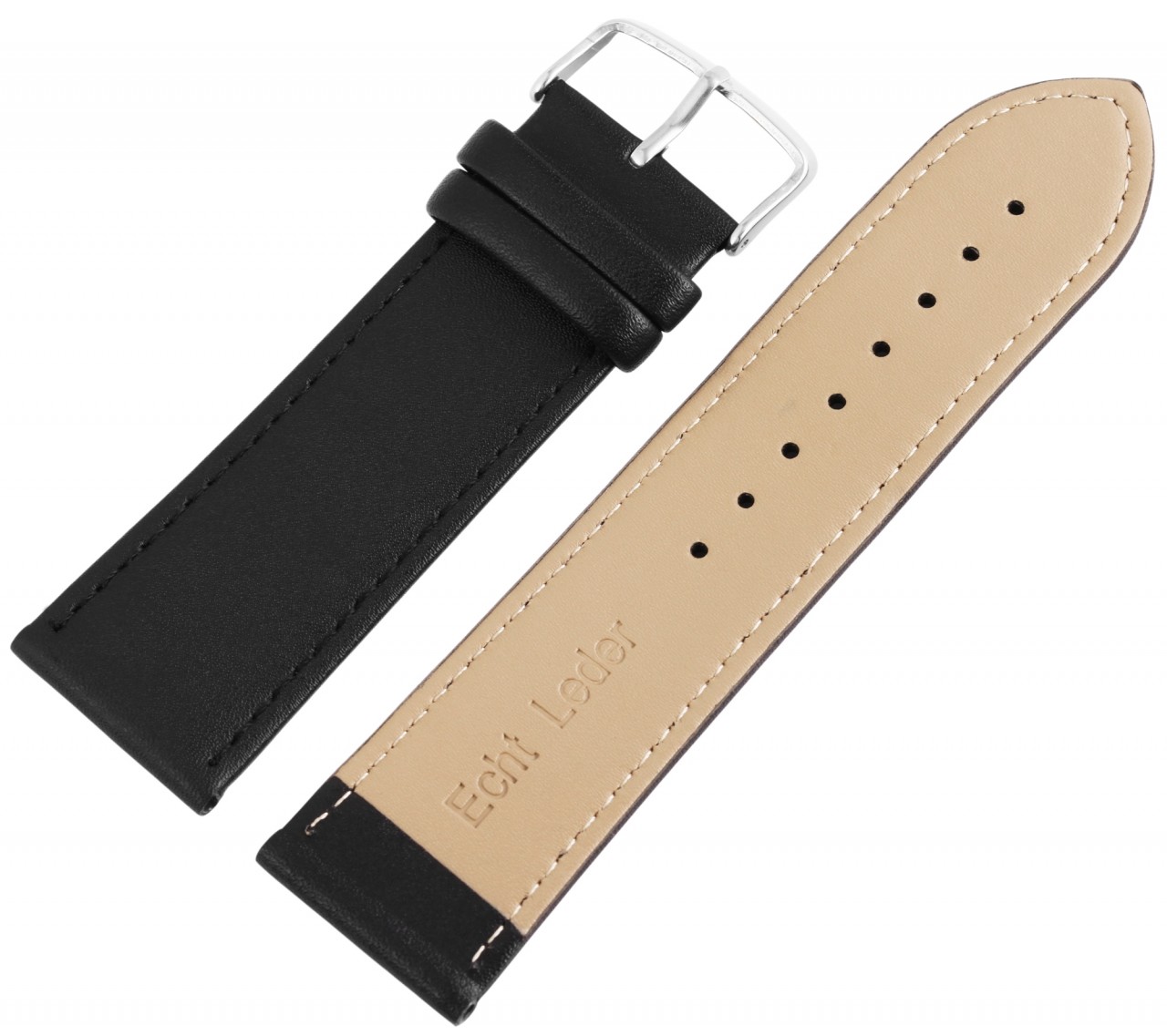A pulseira preta em couro genuíno está disponível em larguras de 10 mm, 12 mm, 14 mm, 16 mm, 18 mm, 20 mm, 22 mm, 24 mm e 26 mm. Tem uma superfície lisa e acabamento com uma fina costura preta. A espessura do material é de 3 mm. A pulseira de substituição tem um comprimento total entre 19 cm e 21,5 cm. O comprimento total depende da largura do terminal. A alça do fecho é 2 mm mais estreita que a largura da alça porque a faixa é estreitamente estreita. A pulseira simples do relógio pode ser aberta e fechada com uma fivela prateada.