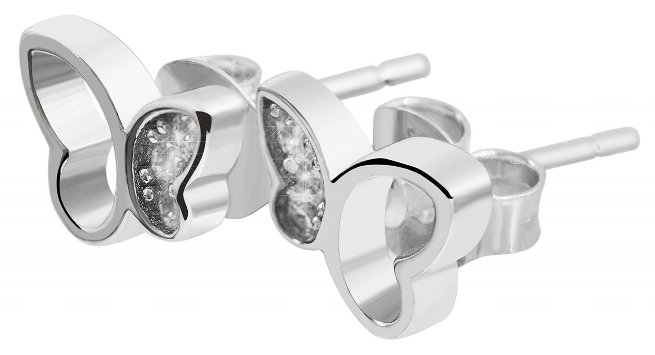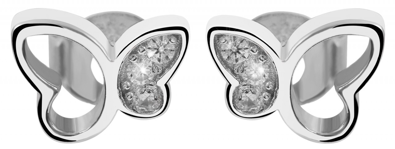 Os brincos infantis em forma de pequenas borboletas são feitos de prata esterlina 925 e adicionalmente banhados a ródio. Este revestimento protege o material de manchas e garante um brilho radiante. Uma asa de borboleta é incrustada com três pedras de zircônia, a outra asa é aberta. Os brincos podem ser presos ao orifício da orelha usando um parafuso borboleta feito de prata verdadeira. O tamanho resulta de um comprimento de 6 mm, largura de 7,5 mm e espessura de 2 mm. Por toda parte, os brincos são um ótimo acessório que faz brilhar os olhos das meninas.