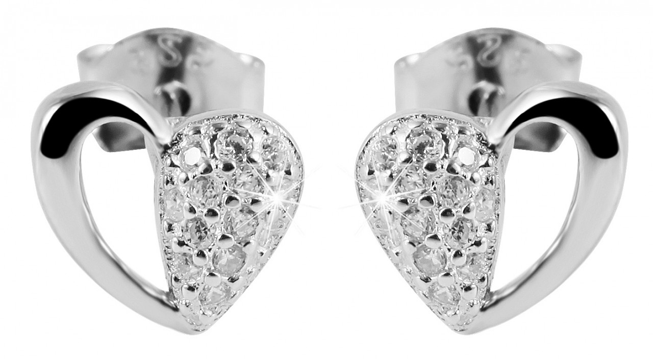 Os brincos em forma de coração assimétrico são feitos de prata esterlina 925 e adicionalmente refinados com um revestimento de ródio. Esta camada protege o material contra manchas. Metade dos brincos de coração estão abertos, a outra metade é decorada com 13 pedras de zircônia. Os brincos são presos ao orifício da orelha com um parafuso borboleta, que também é feito de prata verdadeira. O tamanho resulta de um comprimento de 6 mm, largura de 7 mm e espessura de 2,5 mm.