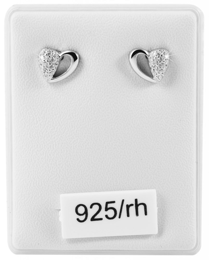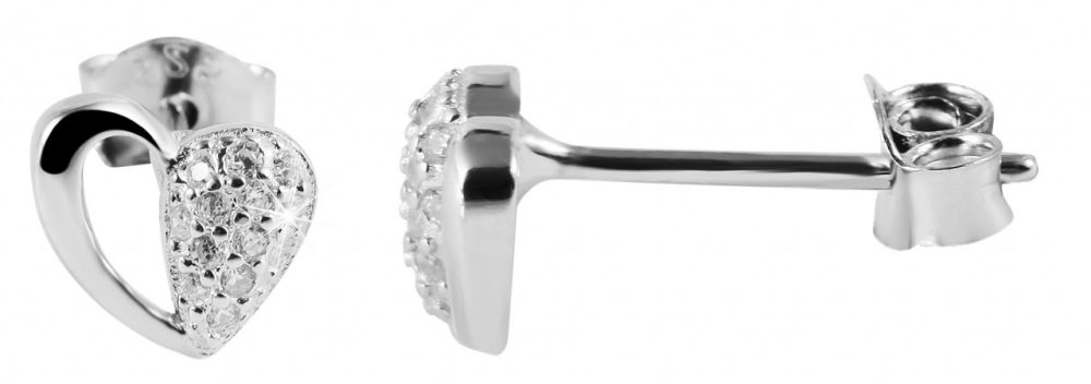 Os brincos em forma de coração assimétrico são feitos de prata esterlina 925 e adicionalmente refinados com um revestimento de ródio. Esta camada protege o material contra manchas. Metade dos brincos de coração estão abertos, a outra metade é decorada com 13 pedras de zircônia. Os brincos são presos ao orifício da orelha com um parafuso borboleta, que também é feito de prata verdadeira. O tamanho resulta de um comprimento de 6 mm, largura de 7 mm e espessura de 2,5 mm.