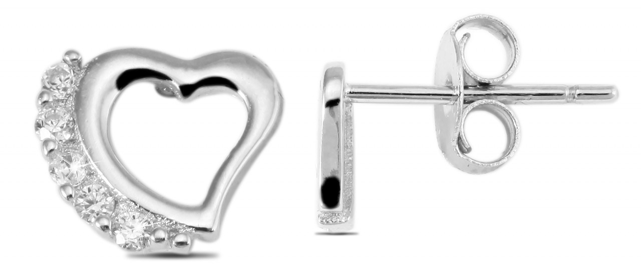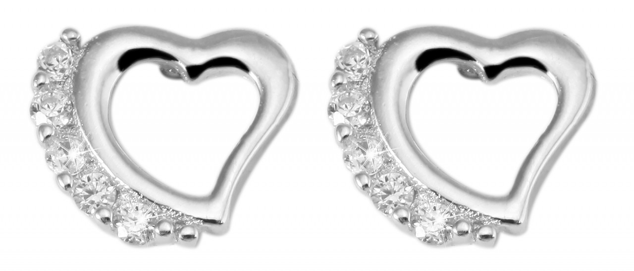 Os brincos em forma de coração são feitos de prata esterlina 925 e adicionalmente banhados a ródio. Este revestimento de ródio de alta qualidade protege as joias de manchas e também lhes confere um brilho radiante e duradouro. Os brincos de coração são abertos no meio e a metade é decorada com cinco pedras brilhantes de zircônia. Isso dá aos brincos um charme elegante. Eles podem ser fixados no orifício da orelha com um prático parafuso borboleta. O tamanho resulta de um comprimento de 6 mm, largura de 7 mm e espessura de 1 mm.