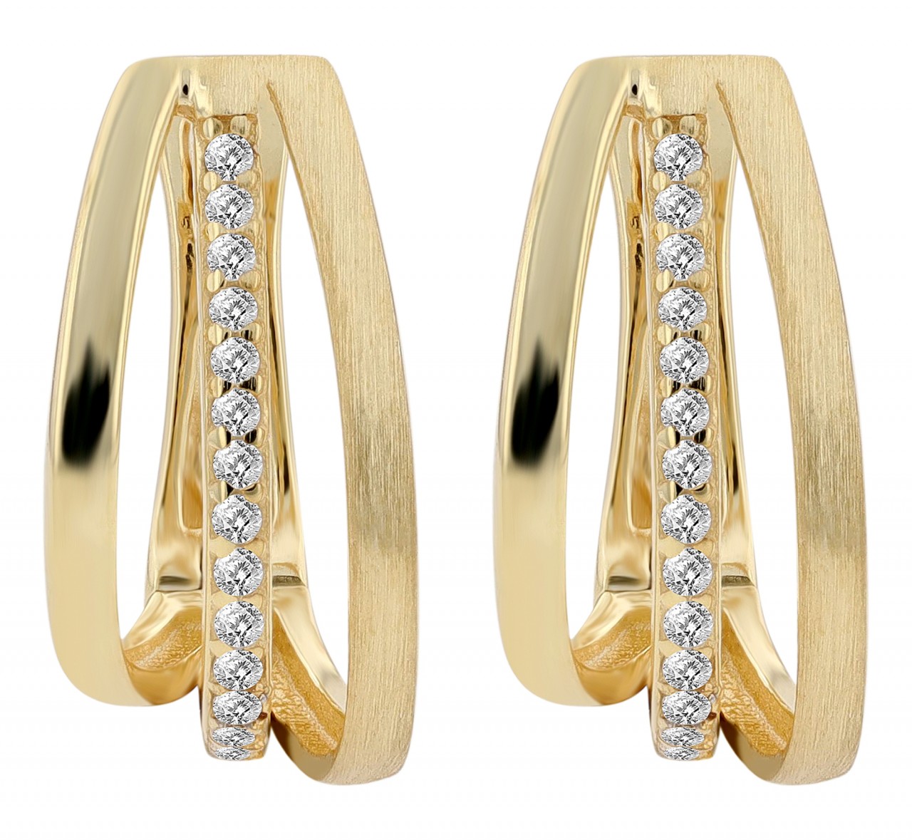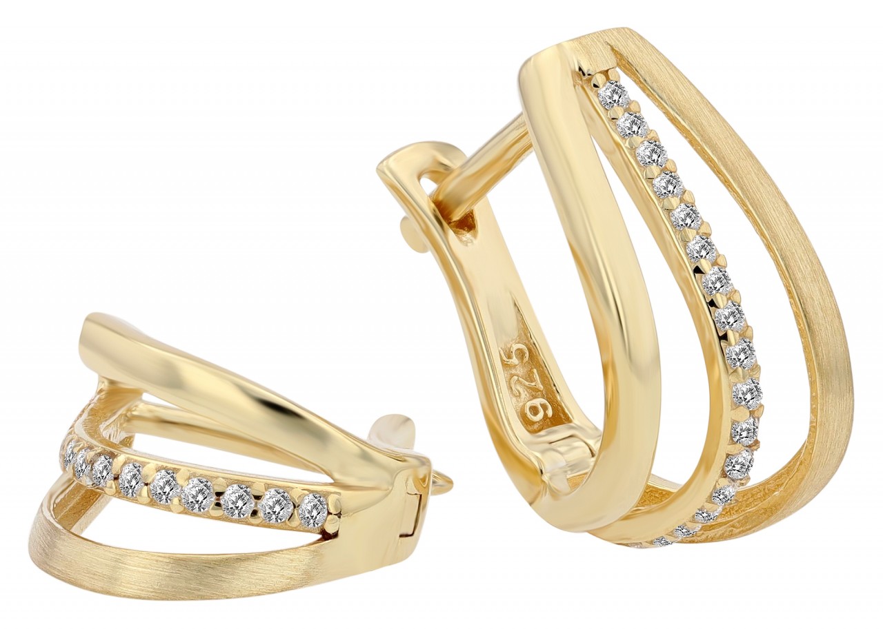 Estes brincos extraordinários feitos de prata esterlina 925 com banho de ouro não são apenas peças de joalheria; eles são uma interpretação de elegância e exclusividade. O seu design especial de três fios com acabamentos diferentes confere-lhes um dinamismo e uma modernidade que irão encantar você. Medindo 16 x 7 x 1,5 mm, eles são sutis, mas atraentes. O banho de ouro adicional confere aos brincos um brilho quente e convidativo. O formato destes brincos cria uma interação fascinante, com a configuração de zircônia criando um toque brilhante, o acabamento polido criando um grande brilho e a superfície fosca criando um contraste atraente.
