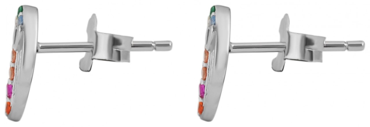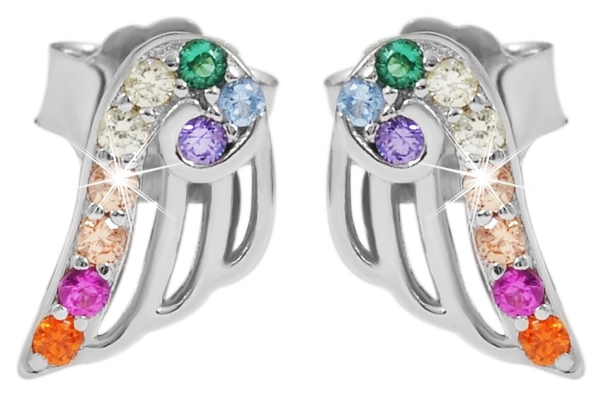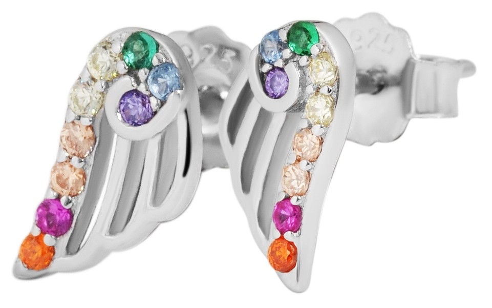 Os brincos coloridos com asas são feitos de prata esterlina 925 e adicionalmente banhados a ródio. O banho de ródio protege o material de manchas e também garante que a joia tenha brilho duradouro. Os pequenos brincos de asa têm pequenos recortes no meio e nove pedras de zircônia dispostas de forma colorida em uma configuração de pinos correm ao longo da borda da asa. As pedras coloridas fazem das asinhas um verdadeiro atrativo e um acessório de moda. Os brincos podem ser presos ao orifício da orelha usando um parafuso borboleta. O tamanho resulta de um comprimento de 10 mm, largura de 5 mm e espessura de 1,5 mm.