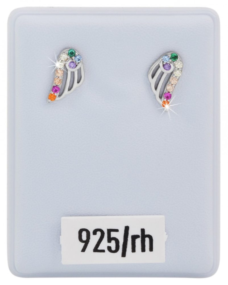 Os brincos coloridos com asas são feitos de prata esterlina 925 e adicionalmente banhados a ródio. O banho de ródio protege o material de manchas e também garante que a joia tenha brilho duradouro. Os pequenos brincos de asa têm pequenos recortes no meio e nove pedras de zircônia dispostas de forma colorida em uma configuração de pinos correm ao longo da borda da asa. As pedras coloridas fazem das asinhas um verdadeiro atrativo e um acessório de moda. Os brincos podem ser presos ao orifício da orelha usando um parafuso borboleta. O tamanho resulta de um comprimento de 10 mm, largura de 5 mm e espessura de 1,5 mm.