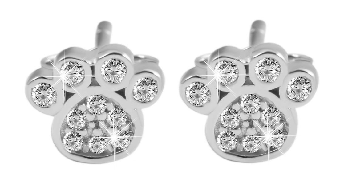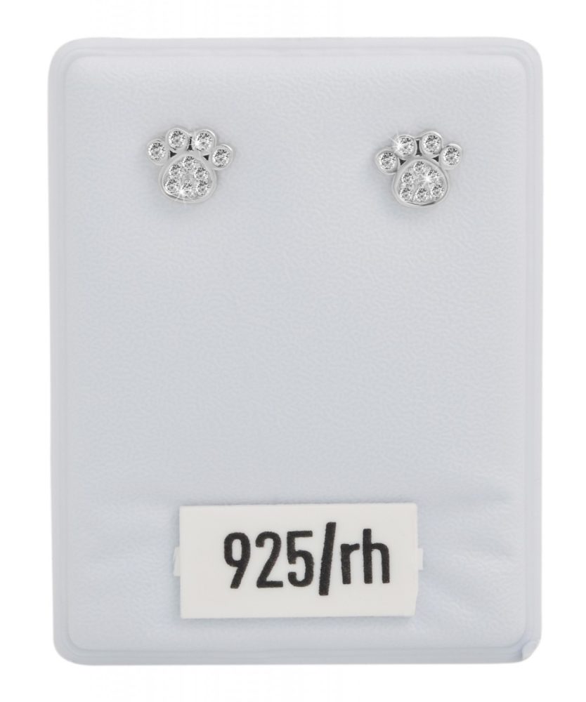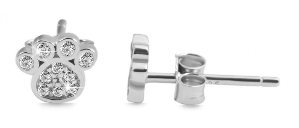 Os lindos brincos infantis em forma de pequenas patas são feitos de prata esterlina 925 e adicionalmente refinados com um revestimento de ródio. Esta camada protege o material da oxidação e confere-lhe um brilho intenso. As pequenas patas do cachorro são totalmente decoradas com dez pedras de zircônia. Os brincos podem ser presos na parte de trás do orifício da orelha com um parafuso borboleta, que também é feito de prata verdadeira. O tamanho resulta de um comprimento de 5,5 mm, largura de 6 mm e espessura de 1 mm.