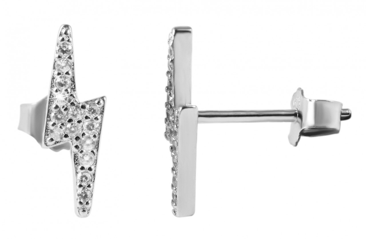 Os brincos femininos em forma de pequenos raios são feitos de prata esterlina 925 e decorados com 14 pedras de zircônia em forma de pinos. O revestimento de ródio evita manchas no material e garante brilho radiante e duradouro. Além disso, os brincos podem ser fixados ao orifício da orelha com um parafuso borboleta. O tamanho resulta de um comprimento de 13 mm, largura de 4 mm e espessura de 1,5 mm. Esses brincos são eletrizantes e vão embelezar qualquer look!