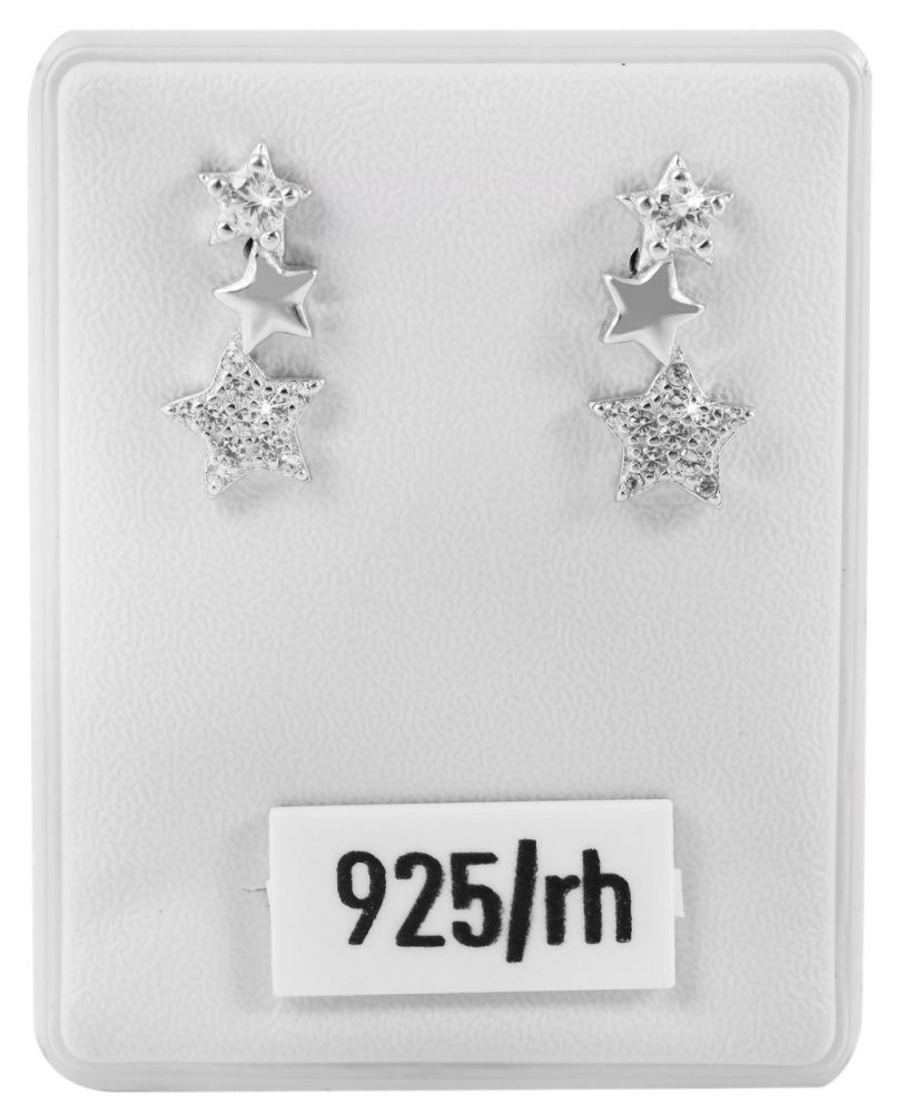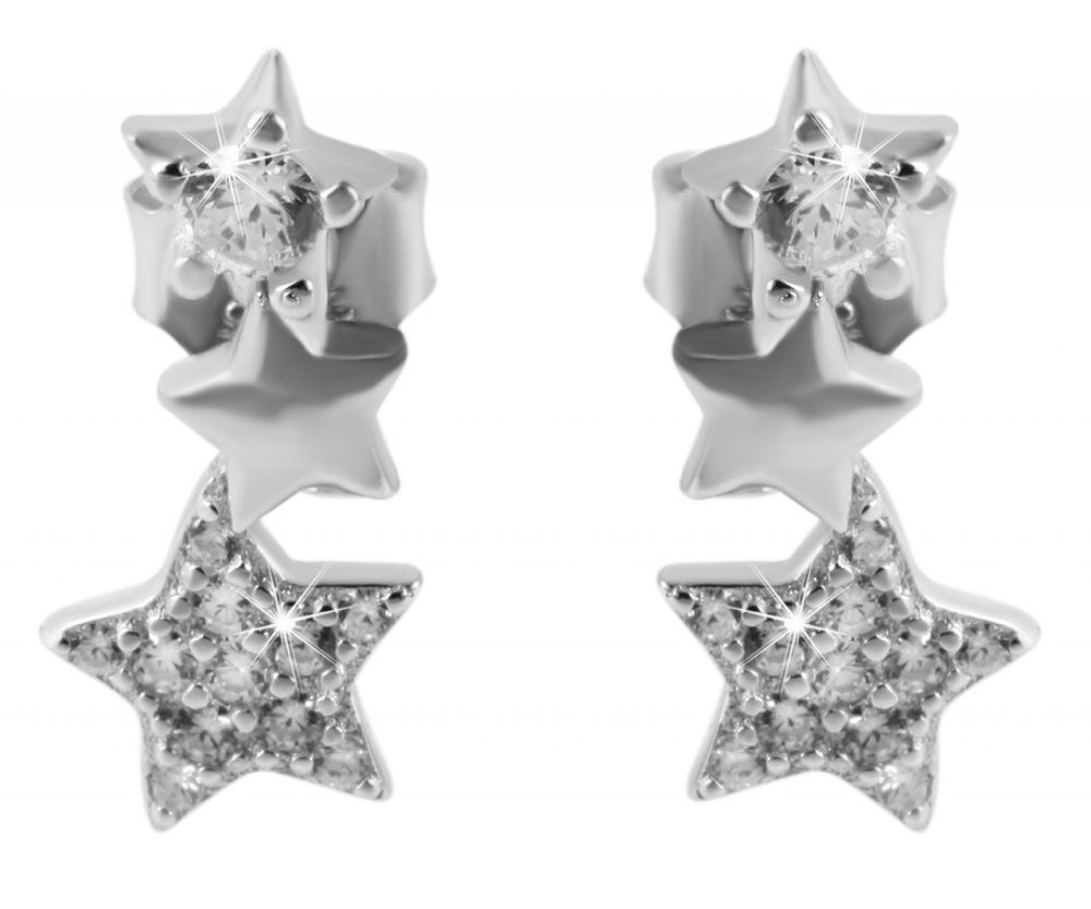 Os brincos feitos de prata esterlina 925 também são banhados a ródio. O revestimento protege o material de manchas e garante um visual elegante e muito brilho. As três estrelas alinhadas uma ao lado da outra têm um desenho astronômico sutil. As doze pedras de zircônia embutidas dão aos brincos um toque elegante. Os brincos podem ser fixados na parte de trás do orifício da orelha com um parafuso borboleta feito de prata verdadeira. O tamanho resulta de um comprimento de 14 mm, largura de 7 mm e espessura de 1 mm.