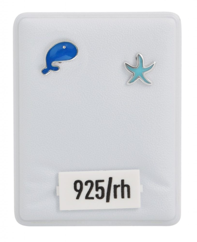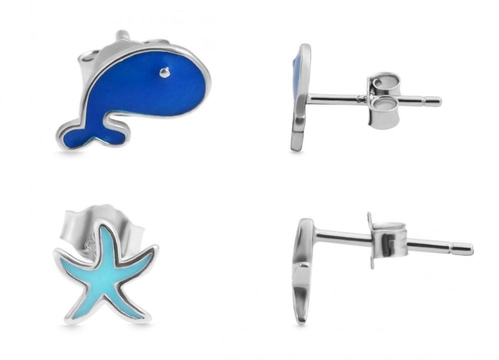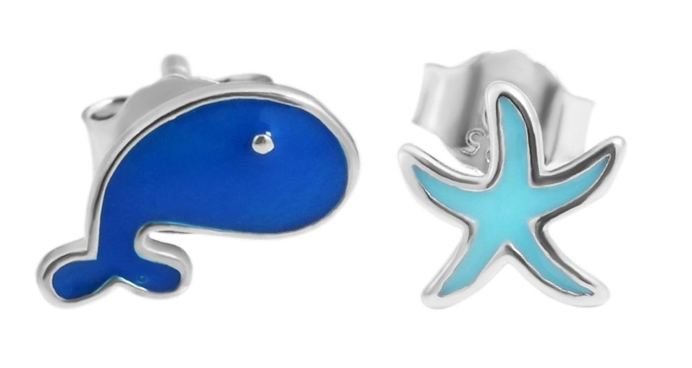 Os brincos infantis são feitos de prata esterlina 925 e adicionalmente banhados a ródio. O revestimento de ródio de alta qualidade protege as joias de manchas e confere-lhes um brilho radiante. Os lindos brincos têm o formato de um golfinho e de uma estrela do mar, ambos refinados com esmalte azul claro e azul. Os brincos podem ser fixados ao orifício da orelha com um prático parafuso borboleta. O tamanho resulta de um comprimento de 9 mm, largura de 5 mm e espessura de 1 mm.