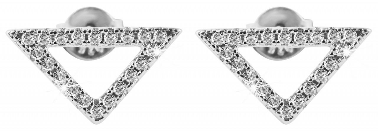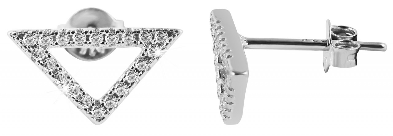 Os brincos femininos triangulares são confeccionados em prata de lei 925 e adicionalmente banhados a ródio, protegendo-os de manchas e proporcionando-lhes um brilho radiante. Os brincos são decorados com recortes, por isso são abertos no meio e incrustados com 20 pedras de zircônia branca na borda. Os brincos da moda podem ser presos ao orifício da orelha usando um parafuso borboleta. O formato geométrico dos brincos os torna um acessório moderno. O tamanho resulta de um comprimento de 7 mm, largura de 12,5 mm e espessura de 2 mm.
