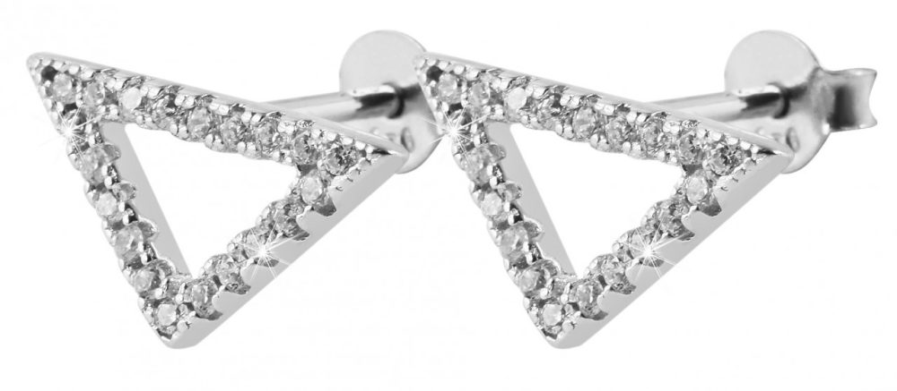 Os brincos femininos triangulares são confeccionados em prata de lei 925 e adicionalmente banhados a ródio, protegendo-os de manchas e proporcionando-lhes um brilho radiante. Os brincos são decorados com recortes, por isso são abertos no meio e incrustados com 20 pedras de zircônia branca na borda. Os brincos da moda podem ser presos ao orifício da orelha usando um parafuso borboleta. O formato geométrico dos brincos os torna um acessório moderno. O tamanho resulta de um comprimento de 7 mm, largura de 12,5 mm e espessura de 2 mm.