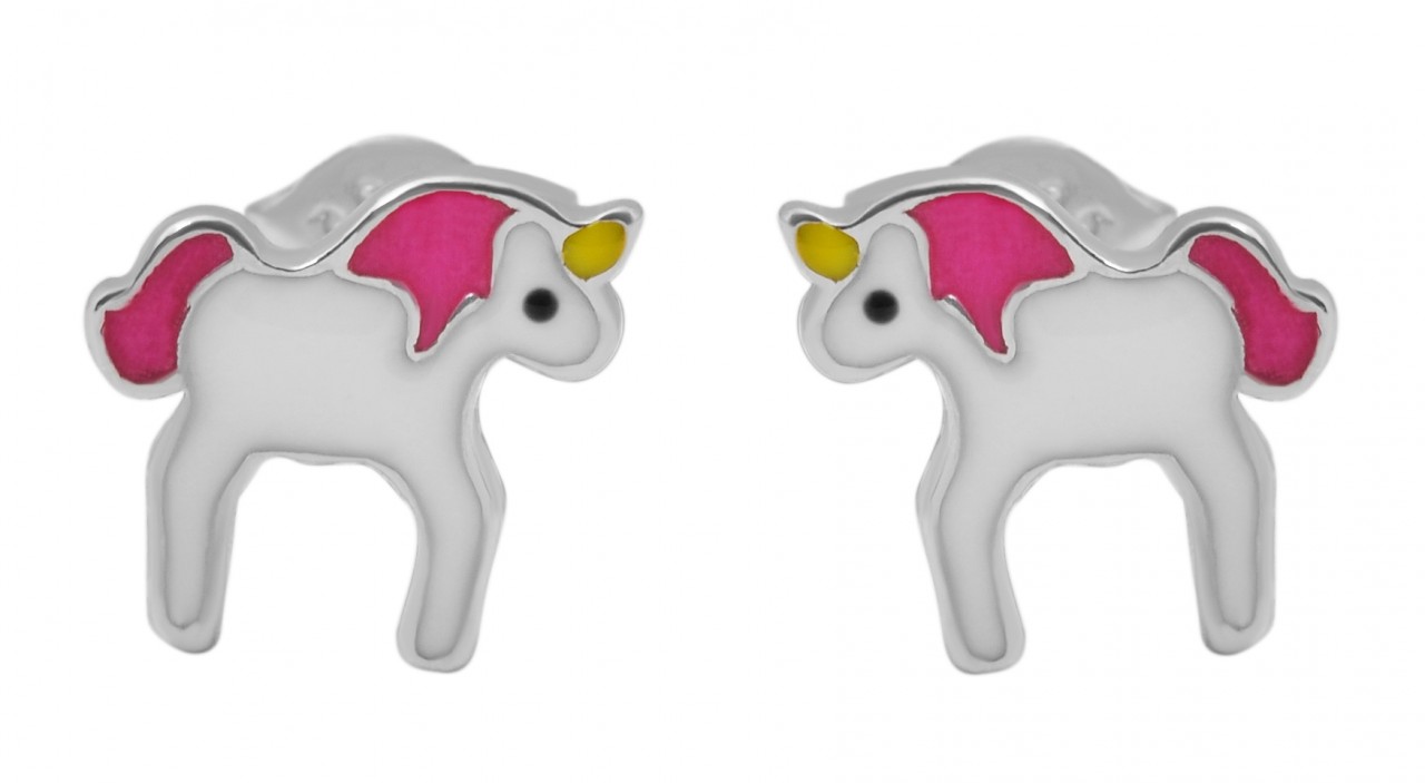 Os lindos brincos infantis em forma de unicórnio são feitos de prata esterlina 925 e também banhados a ródio. Isso significa que você pode desfrutar da joia por muito tempo, ela fica protegida de manchas e tem um brilho radiante. Os brincos são equipados com detalhes amorosos e fazem o coração das meninas bater mais rápido. Os pequenos unicórnios são preenchidos com esmalte branco, a crina e a cauda são rosadas, o chifre é amarelo. Os brincos infantis podem ser presos na parte de trás do orifício da orelha com um parafuso borboleta feito de prata verdadeira. O tamanho resulta de um comprimento de 9,5 mm, largura de 9,5 mm e espessura de 1 mm.