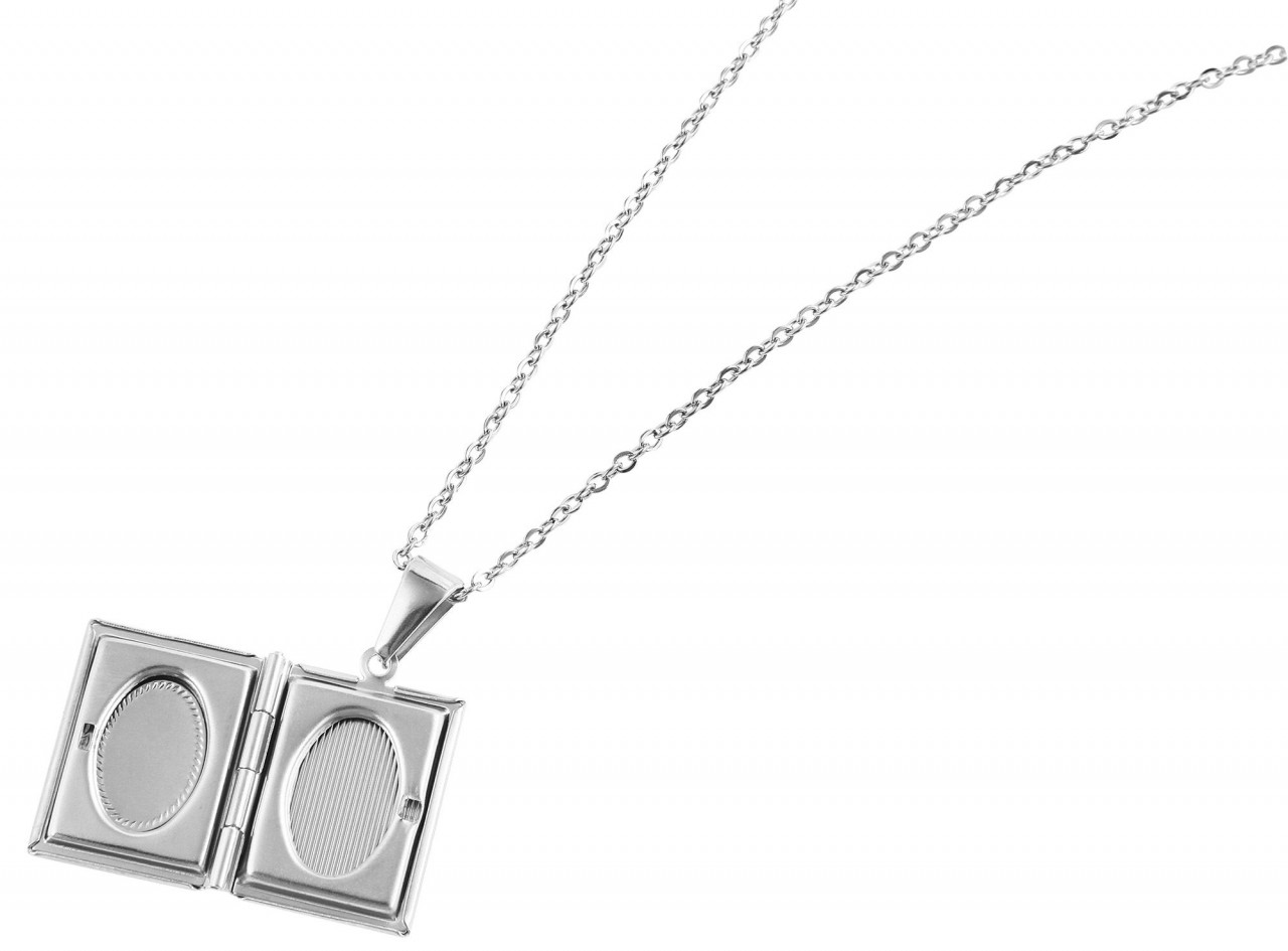 O colar com padrão de âncora da Akzent é feito de aço inoxidável e apresenta um pingente de medalhão em forma de livro. A corrente tem 45 cm de comprimento e 1 mm de espessura. Além disso, uma corrente de extensão de 5 cm de comprimento é presa à ponta da corrente. O colar pode ser aberto e fechado com um fecho de pressão de aço inoxidável. O pingente de aço inoxidável tem comprimento de 26 mm, largura de 18 mm e espessura de 4,5 mm.