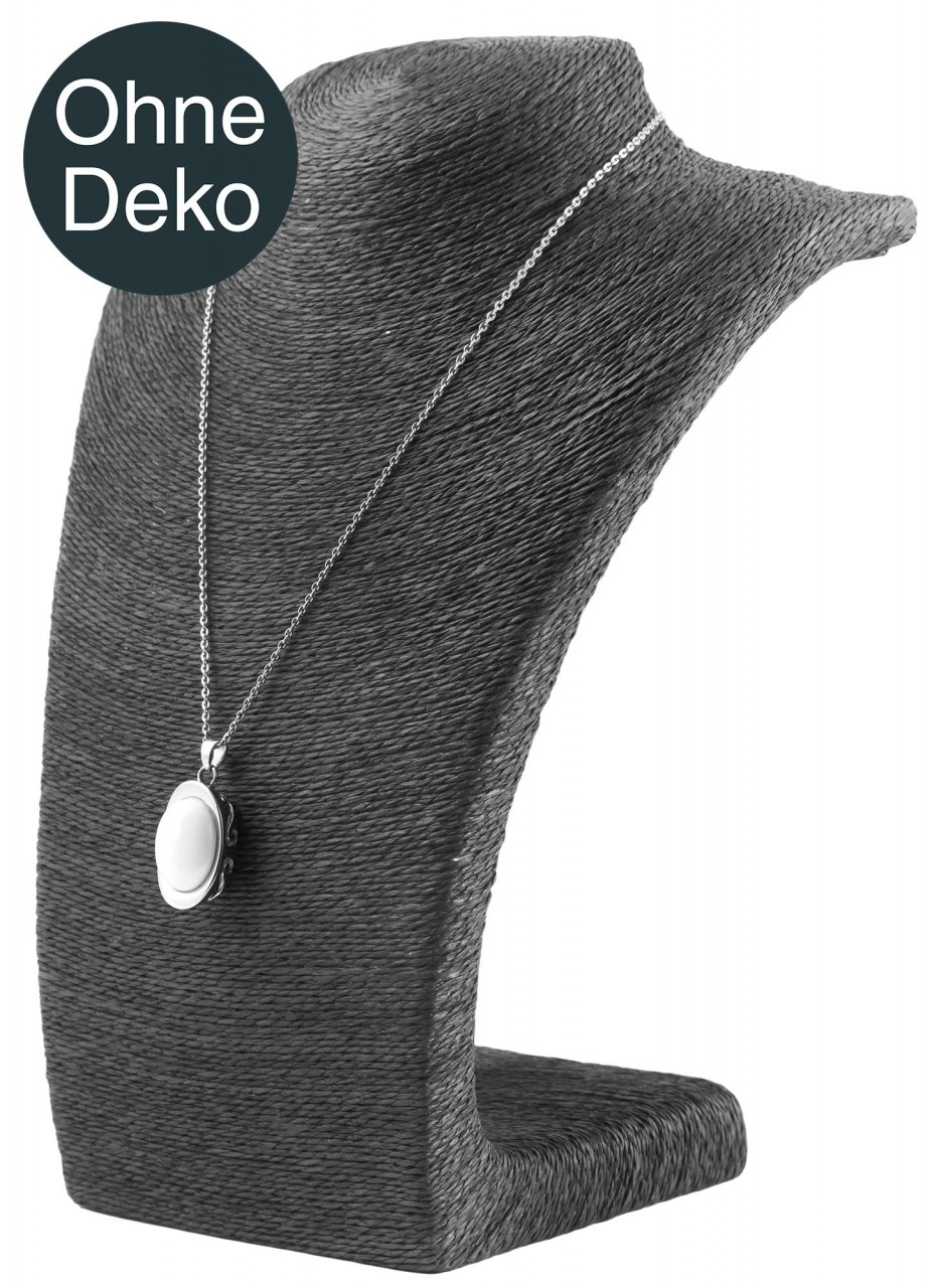 O porta-joias em formato de busto simples é feito de fibra liberiana, essas fibras garantem um visual decorativo e de alta qualidade. O busto é ideal para apresentar joias. Seja no balcão, na vitrine ou na sala de exposição, o busto tem uma bela figura em todos os lugares. As dimensões do estande são 27 cm de comprimento, 21 cm de largura e 12 cm de espessura.