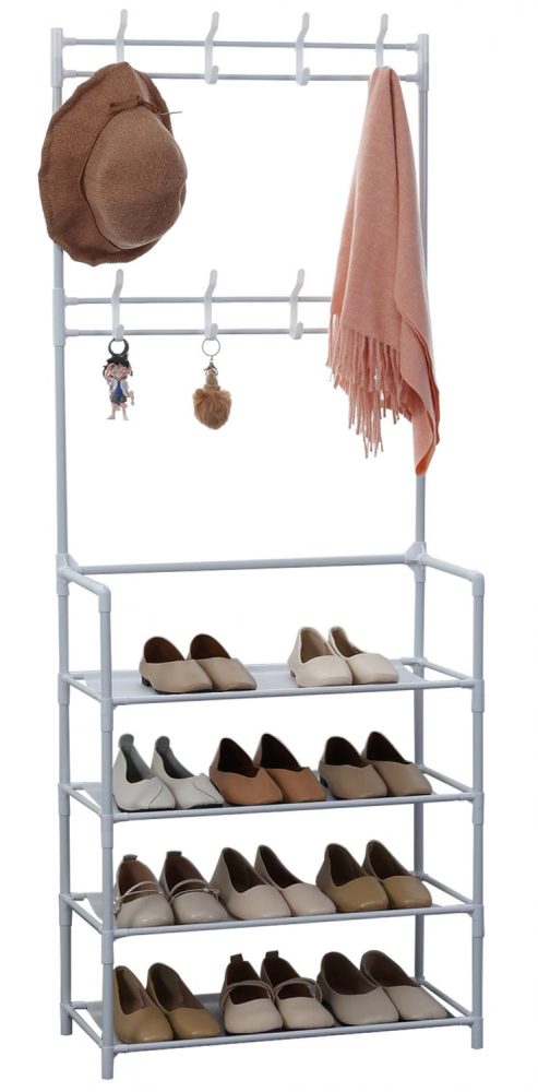 - Funcionalidade: Combina cabide e sapateira para uma organização eficiente