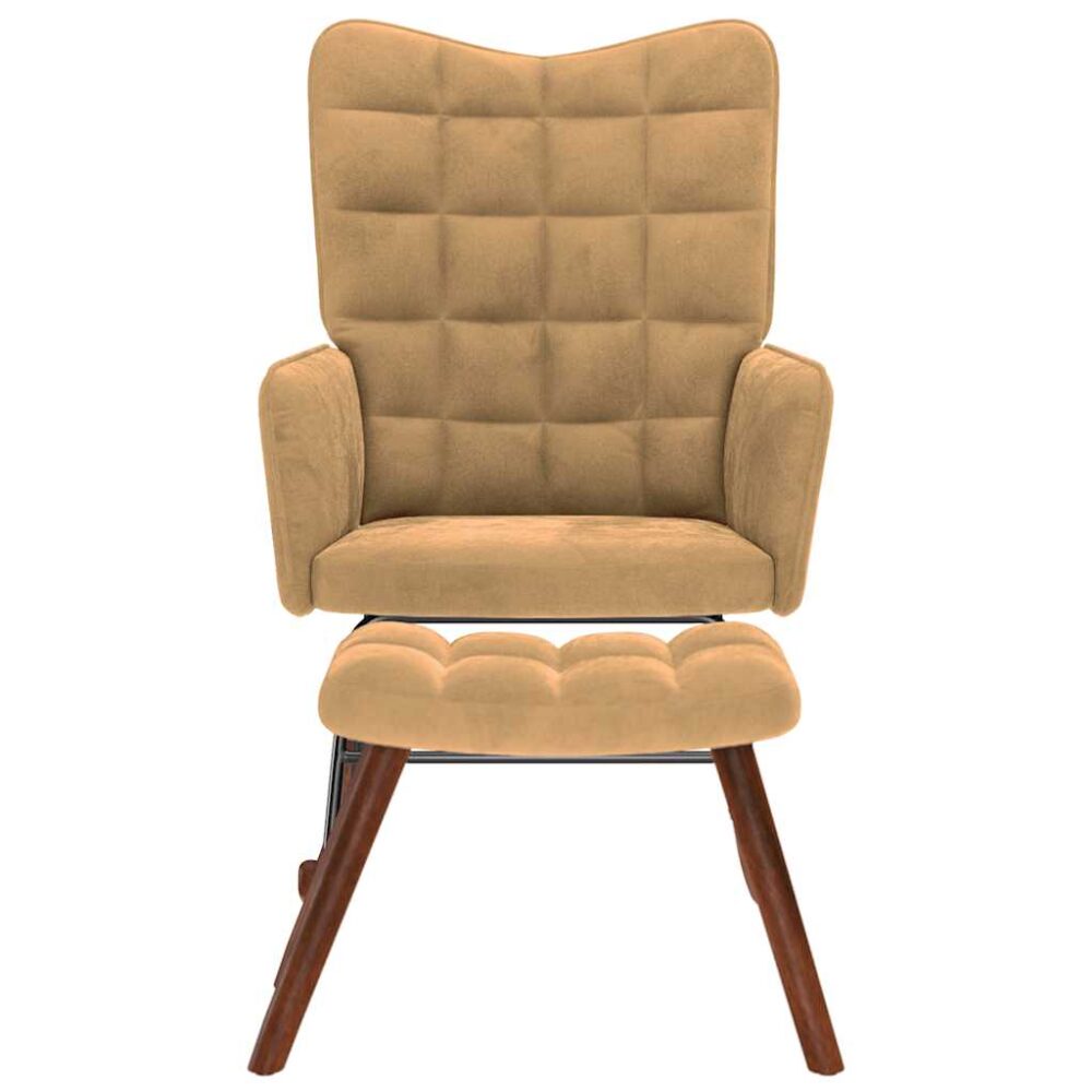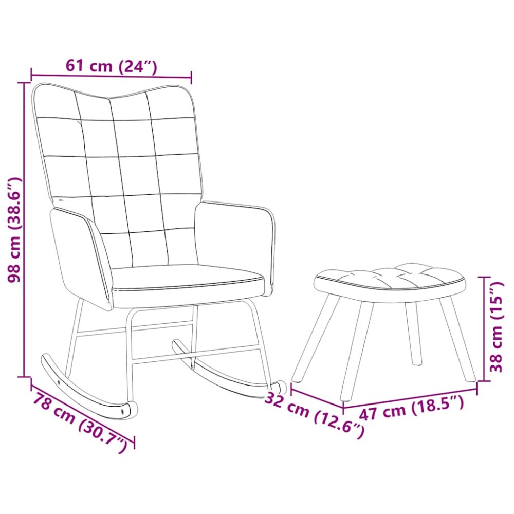 Está à procura de uma cadeira onde possa descansar completamente após um dia agitado? Esta cadeira de baloiço confortável com um banco é a escolha perfeita! Material suave e confortável: o tecido de veludo apresenta uma superfície delicada e suave que proporciona uma sensação agradável em contacto com a pele, proporcionando-lhe aconchego e o máximo conforto.Estrutura resistente e estável: A estrutura de contraplacado e metal da poltrona garante robustez e estabilidade.Experiência de assento confortável: A poltrona vem com o assento e encosto espessamente acolchoados, bem como apoios de braço para grande conforto.Pés de madeira: Os pés de madeira proporcionam uma excelente estabilidade, dando ao cadeirão um aspeto natural e agradável. Com o design das longas calhas de balanço, a poltrona não tomba facilmente.Apoios para os pés versáteis: O banco é versátil, servindo como um confortável apoio para os pés quando você está reclinado na cadeira ou como um assento extra.Aplicações amplas: Esta espreguiçadeira é uma adição versátil e elegante para qualquer área de lazer em casa ou escritório. Se você colocá-lo perto do sofá da sala de estar ou criar um canto acolhedor em seu quarto ou estudo, ele irá melhorar a estética do seu espaço de estar.