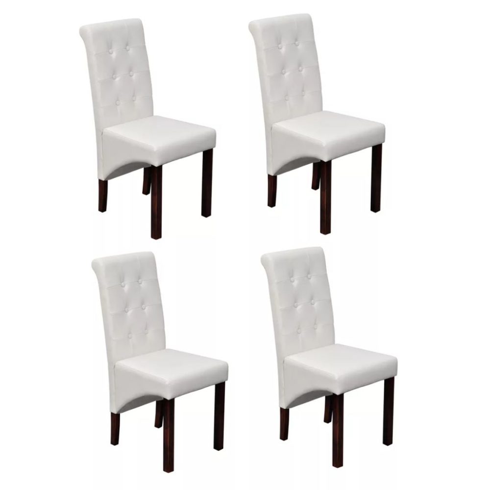 Este conjunto de 4 cadeiras de jantar grandes e confortáveis tem um design antigo e assentos e encostos ergonómicos. As pernas são feitas em madeira envernizada maciça na cor castanho-escuro e os cantos são arredondados para maior segurança. As cadeiras podem ser facilmente mantidas e limpas. Os assentos e encostos das cadeiras de jantar estão acolchoados com couro artificial durável.