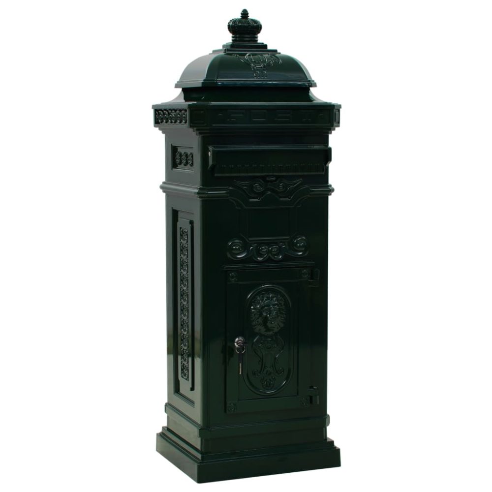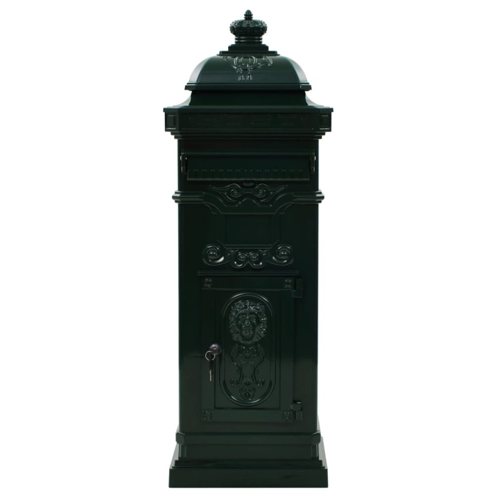 Esta caixa de correio foi concebida com uma larga ranhura para o correio e possui uma aba para proteger o conteúdo das intempéries e duas portas bloqueáveis (2 chaves incluídas para cada porta) para poder tirar facilmente a correspondência. A caixa de correio é feita em alumínio fundido resistente às intempéries e à prova de ferrugem, o que a torna muito adequada para utilização no exterior. Está adornada com uma abundância de requintados detalhes decorativos em estilo vintage e tornar-se-à um verdadeiro atrativo no seu caminho de acesso ou entrada.