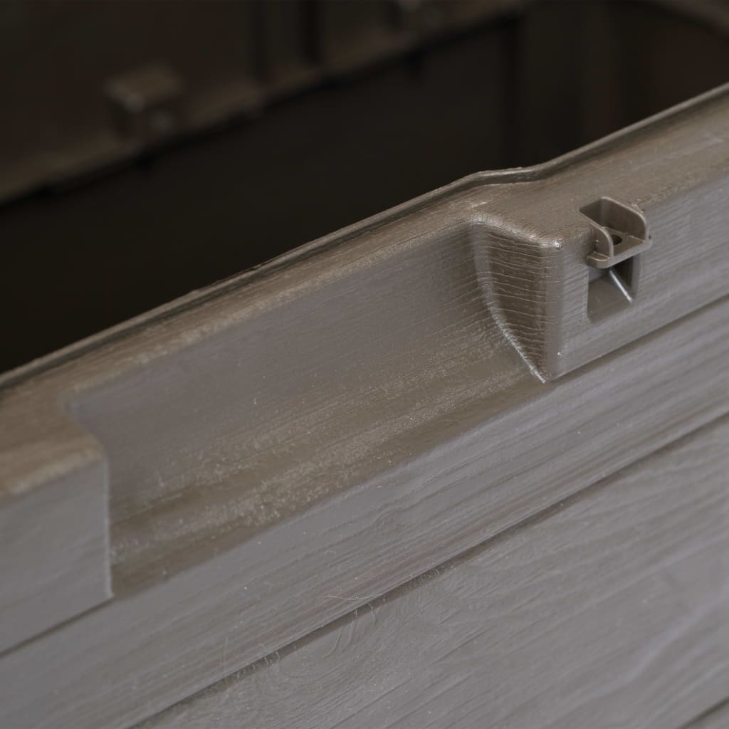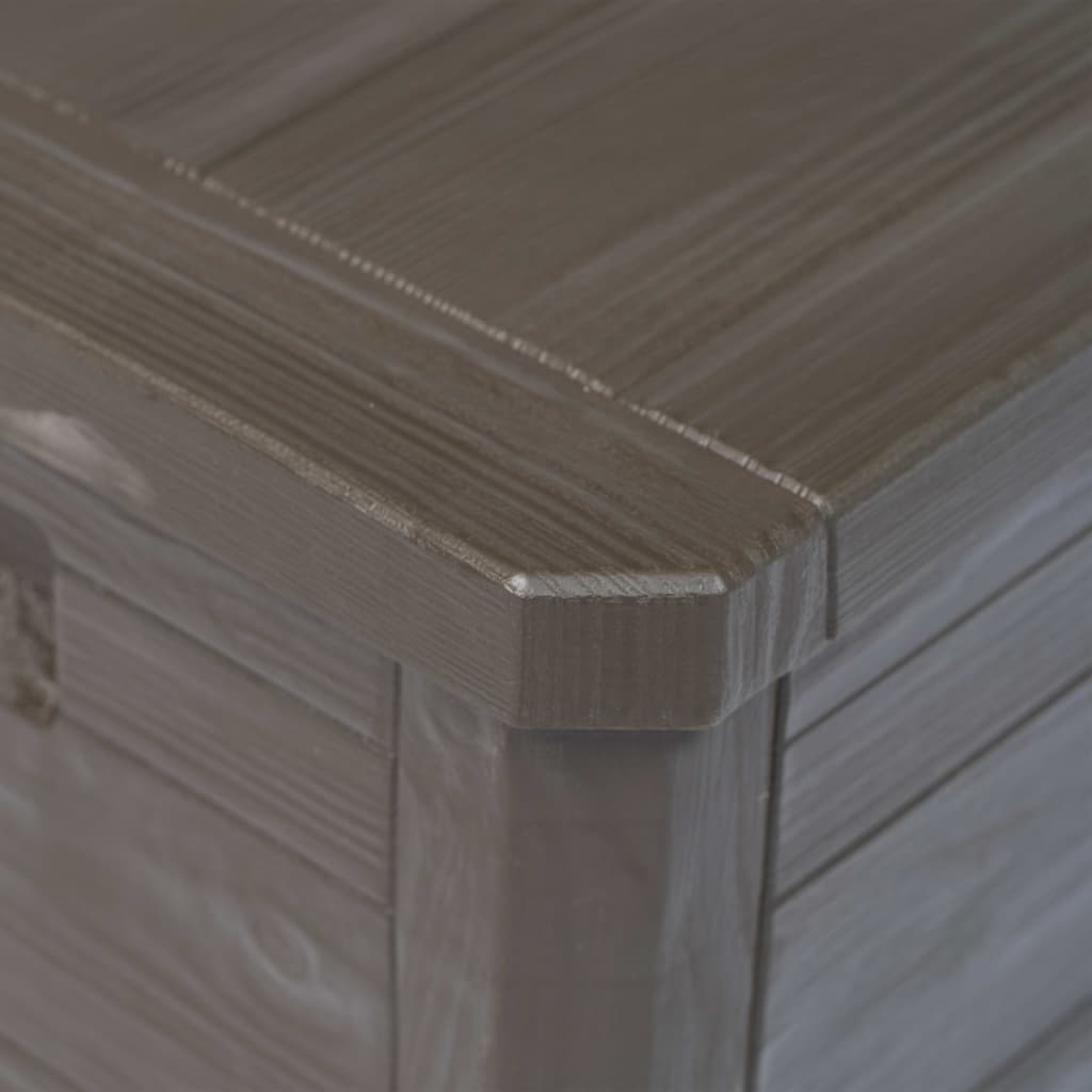 É feita de um plástico durável e resistente às intempéries, o que a torna perfeita para utilização no interior e no exterior. O design com textura de madeira confere à caixa de arrumação para jardim um ar discreto mas intemporal, que se adapta bem a qualquer estilo de decoração.