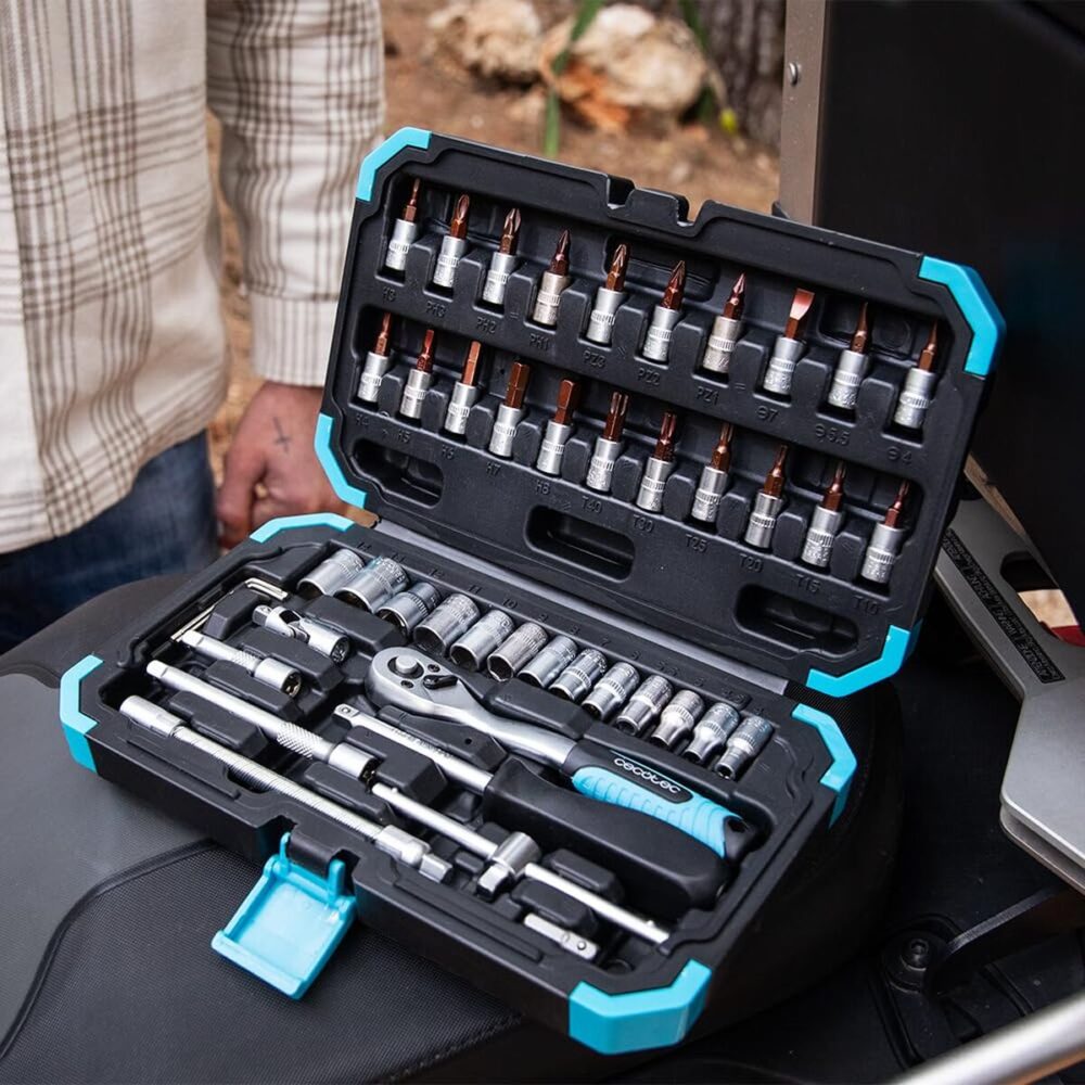 O maletim de ferramentas KRK 2200 Cecotec é uma caixa de ferramentas compacta concebida para tarefas de montagem, manutenção e reparação, domésticas ou profissionais, oferecendo um conjunto de 46 peças cuidadosamente selecionadas para trabalhar com eficácia e organização. O conteúdo inclui uma chave de catraca profissional de 72 dentes, que permite operar com apenas 5° de rotação, proporcionando controlo preciso e movimentos suaves em espaços reduzidos ou de difícil acesso, bem como um jogo de chaves de caixa e soquetes para jantes fabricados em aço Crómio-Vanádio (CR-V), material reconhecido pela elevada resistência ao desgaste e a esforços de binário alto. O kit integra ainda um jogo de pontas com pontas em aço S2, especialmente adequadas para trabalhos de alta precisão e uso intensivo, e uma chave de fendas de precisão com ponta intercambiável compatível com todas as pontas incluídas, o que permite adaptar-se rapidamente a diferentes tipos de parafusos sem necessidade de múltiplas ferramentas. A estrutura do conjunto organiza-se num maletim resistente de cor preta, com organizador interno que mantém cada peça no seu lugar, reduz perdas e facilita a identificação rápida durante o trabalho; tanto a catraca como os soquetes e acessórios são fabricados em aço de alta qualidade para garantir durabilidade e um encaixe firme em porcas e parafusos. Graças ao design robusto, ao tamanho portátil e à combinação equilibrada de soquetes, pontas e chaves de precisão, o Cecotec KRK 2200 afirma-se como um kit de ferramentas versátil e fiável para quem procura um conjunto compacto e bem estruturado para trabalhos mecânicos e de bricolage.