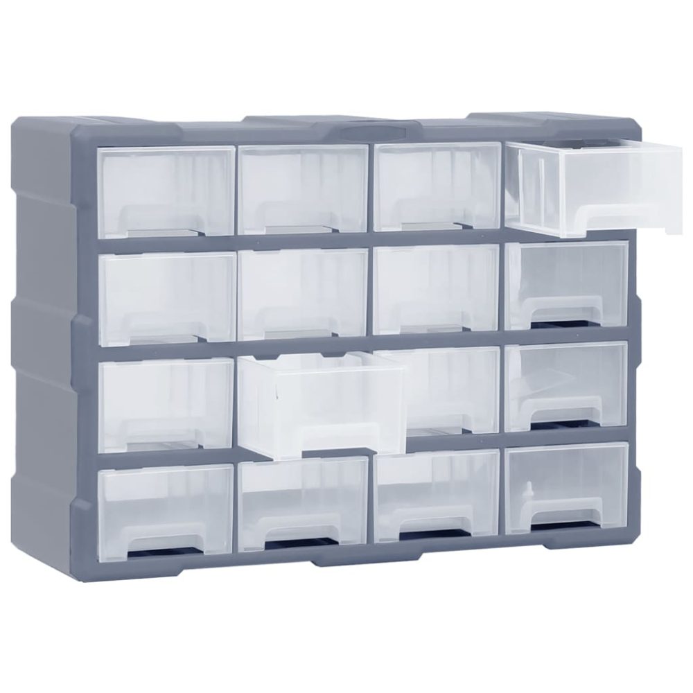 Este indispensável organizador de múltiplas gavetas possui um total de 16 gavetas médias e foi concebido para poder arrumar e organizar uma ampla variedade de artigos. Também pode ser utilizado como caixa de costura ou para arrumar pregos.