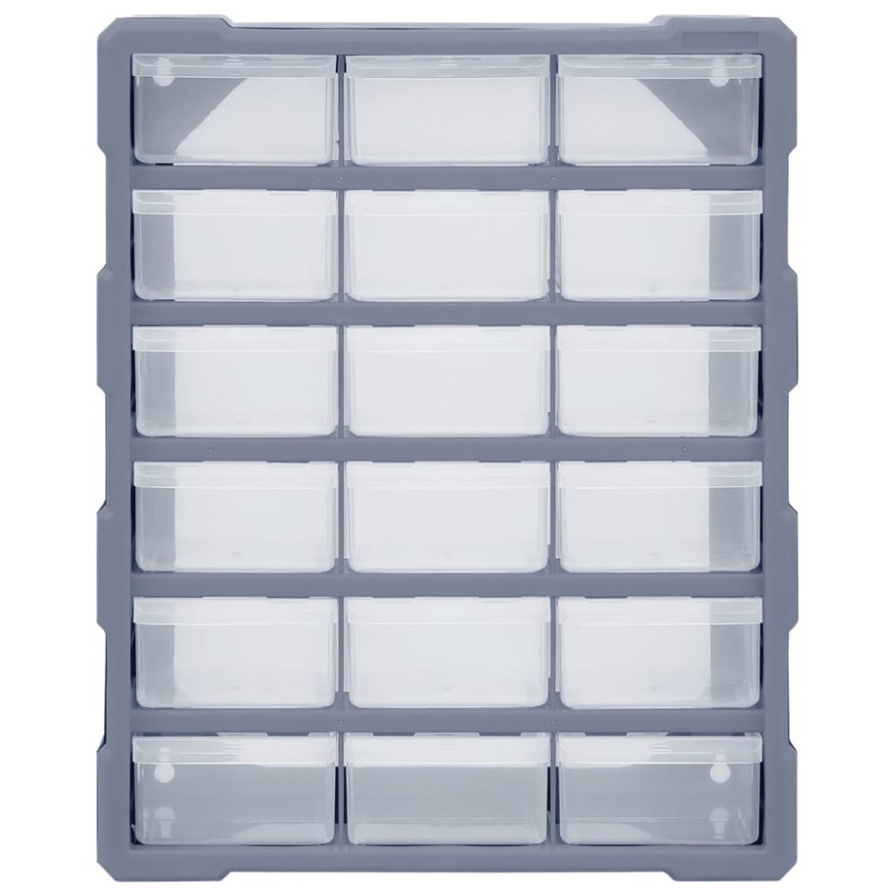 Este indispensável organizador de múltiplas gavetas possui um total de 18 gavetas médias e foi concebido para poder arrumar e organizar uma ampla variedade de artigos. Também pode ser utilizado como caixa de costura ou para arrumar pregos.
