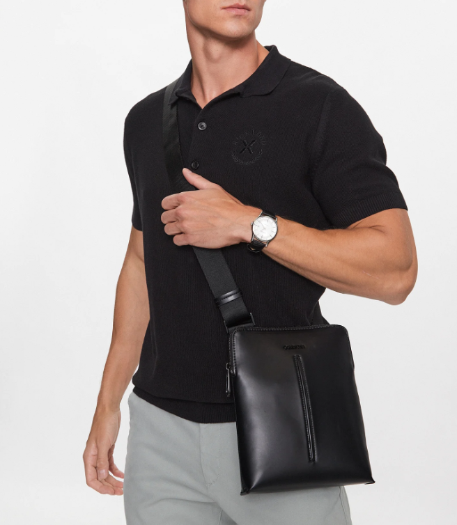 Bolsa com alça ajustável, fecho zip, detalhes contrastantes, logótipo.